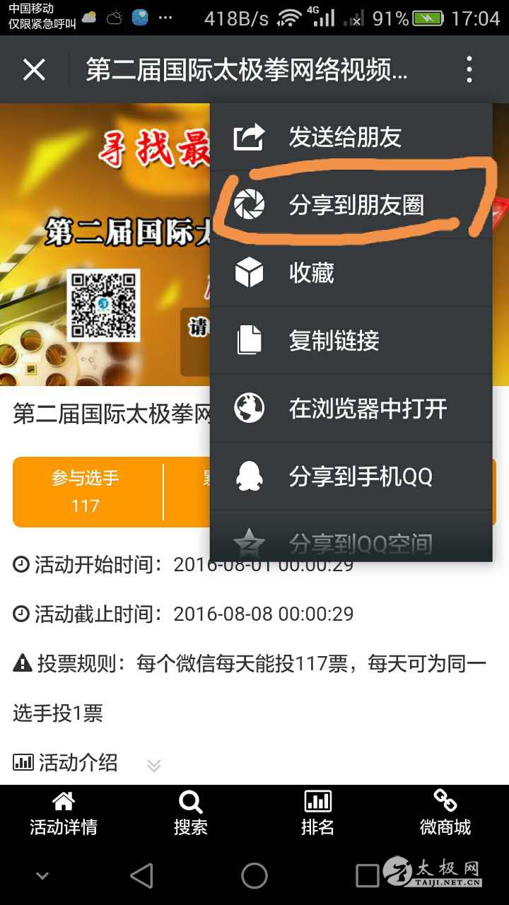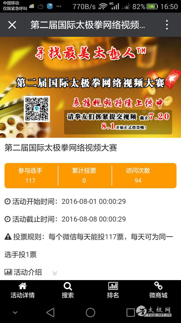 1、 我要去哪里观看参赛视频呢? 手机观看与分享:微信公众号“太极拳” 一键分享,让更多人来看你: 电脑观看:太极网(taiji.net.cn)将为本次活动制作专题网页,并在其他视频网站分享发布,按照收到作品的先后顺序在网上进行展播,同时为参赛作品设置投票系统,于8月1日接受网友投票。 2、 我要参赛,怎么报名? 太极网微信平台报名 扫描二维码报名 扫描二维码报名 Ø 认真填写参赛报名表与视频文件一并发送到大赛组委会,二者缺一不可。视频文件和参赛报名表名称一致,格式为:参赛者姓名+套路名称。 Ø 参赛报名表格可以从太极网下载,内容包括套路名称、参加项目、简短个人介绍、拍摄心得、拍摄地点、拍摄时间等。 报名表下载请点击蓝字:视频大赛报名表.doc Ø 参赛作品可以直接以邮箱、网盘、QQ等形式发送电子版,也可以用光盘、U盘、存储卡等物理存储介质邮寄至组委会。 l 接收视频邮箱: