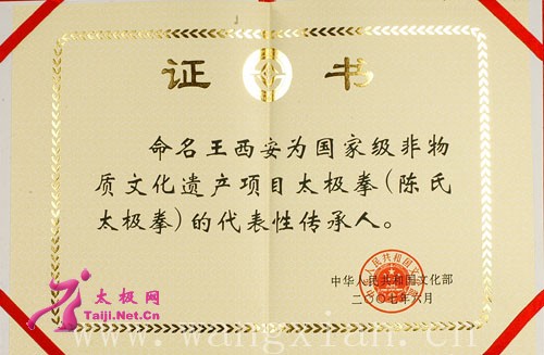 中华人民共和国文化部近日命名王西安、朱天才为国家级非物质文化遗产项目太极拳(陈氏太极拳)的代表性传承人。