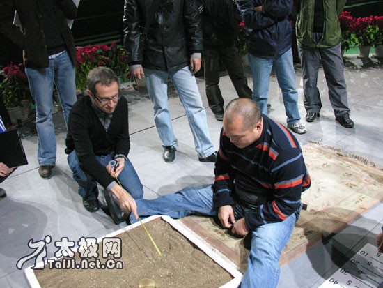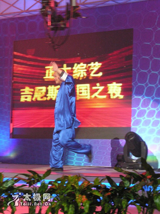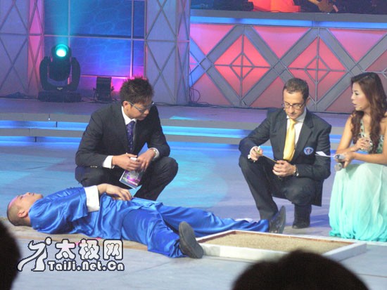 上场后,只见身穿蓝色太极服的王战军首先作了精彩的太极拳套路表演后,而后,躺在地毯上,连续数次呼吸吐纳之后,内气在腹部丹田部位来回鼓荡。在世界吉尼斯见证官马克的见证下,王战军随即将一个专门订做、上面刻有“中国陈家沟武术院王战军专用”字样的铜饼放在肚子上,尔后缓缓收腹,骤然用力一弹,铁饼呈弧线落在76厘米之外的沙堆处,打破世界纪录。第二次,当王战军弹出94厘米时,马克连连惊呼:“太难以置信了!”