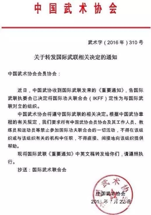| 7月22日,中国武术协会向全国各级武术协会会员协会下发《关于转发国际武联相关决定的通知》(武术字2016[310]号)文件,要求各省、市、县等武术会员协会及其工作人员、教练员和运动员等所有人员禁止参加国际功夫联合会的一切活动,不得在该组织或与该组织有关的机构中任职,不得直接、间接地向该组织提供帮助。 通知全文如下: 中国武术协会会员协会: 近日,中国武协收到国际武联发来的《重要通知》,告国际武联执委会已决定将国际功夫联合会(IKFF)定性为与国际武联对立的组织。 中国武术协会将遵守国际武联的相关决定,根据中国武协章程的有关规定,我们要求所有中国武协会员协会及其工作人员、教练员和运动员等禁止参加国际功夫联合会的一切活动,不得在该组织或与该组织有关的机构中任职,不得直接、间接地向该组织提供帮助。 现将国际武联《重要通知》中英文稿转发你们,请遵照执行。 中国武术协会 2016年7月22日 |