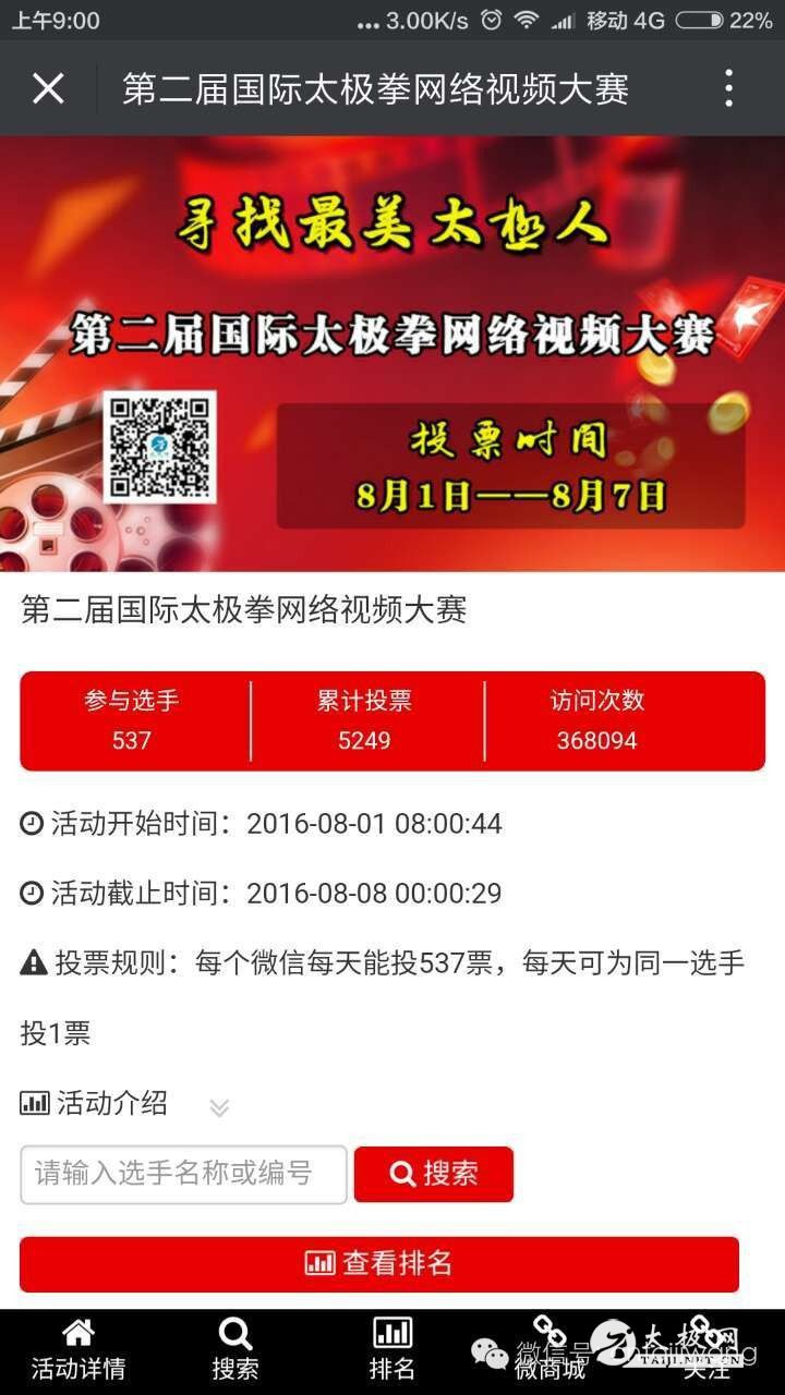 (如果输入“投票”没有弹出视频展播入口,说明您的微信内存不足,需要您清理一下微信内存,然后重启手机哦~) 进入视频展播区后,您可以观看所有参赛者的参赛作品,觉得不错的就为他投一票,也可以将他的太极风采分享至朋友圈与大家共享。 您也可以在搜索框中输入您所关注的选手姓名,观看、投票更方便。
