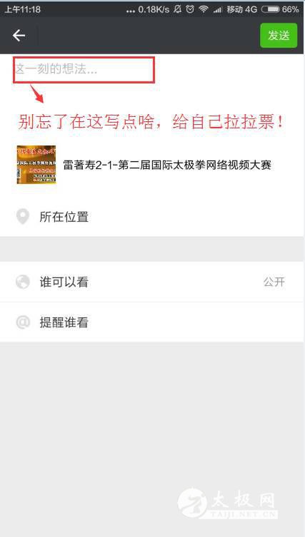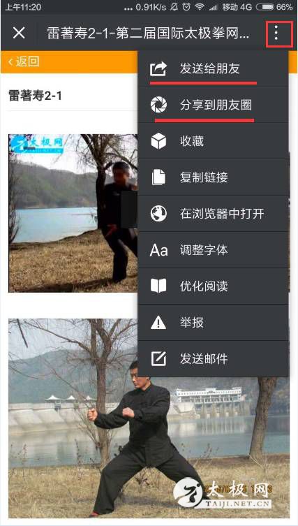 (如果已经关注本平台很久的拳友总是投不上票,可能是微信系统问题。建议拳友们尝试先取消关注“太极拳”微信公众号,然后重新关注“太极拳”cntaijiwang) 方法2:参赛的拳友可以将自己的参赛作品直接分享至朋友圈邀好友为您投票。如下图,找到您的作品后,点击右上角,可以选择发给朋友或者直接分享至朋友圈。