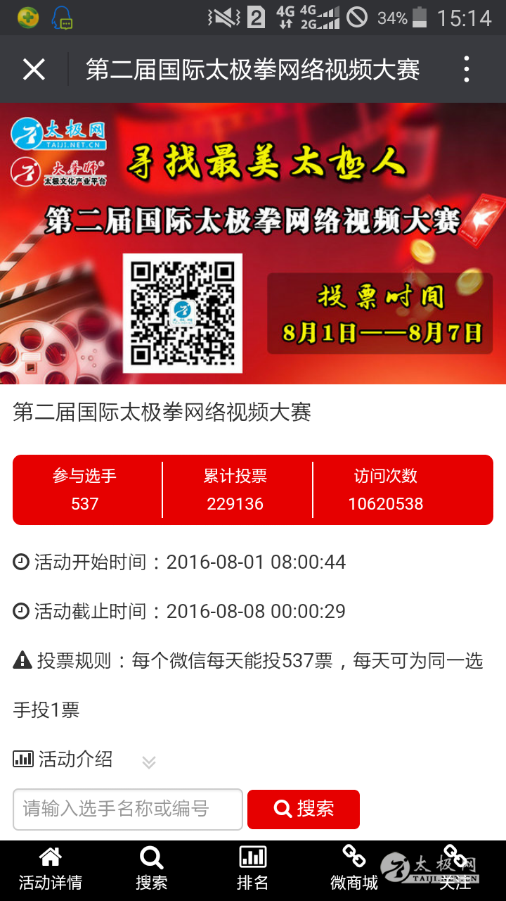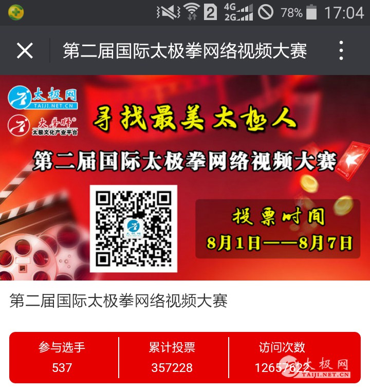 第二届国际太极拳网络视频大赛投票阶段已经进入了第四日,各地太极拳爱好者热情不减,投票系统每天都接收数以万计的投票,展播平台的访问量依旧成倍的增长,不到三天即突破1000万! 8月3日下午访问量突破千万 投票系统在前三天出现了一些网络波动,导致很多拳友的投票出现了延迟,针对这个问题,大赛组委会办公室技术人员紧急对投票系统进行了升级和调整,投票延迟的情况已经的到了明显的改善。出现这个问题也从另一方面反应了各位拳友的热情超过了投票系统的预期设想,充分体现了第二届国际太极拳网络视频大赛的火爆程度! 截止发稿时,视频大赛投票系统已经收到网络投票352874张,展播平台点击量达到12636702次!大赛投票开启四天,网络投票一路逼近40万,展播平台访问量突破千万,第二届国际太极拳网络视频大赛的疯狂席卷全国大地,你,还在观望么? |