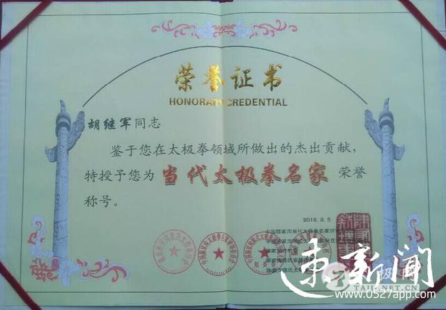 胡继军介绍,此次“当代太极拳名家”评选活动,由中国陈家沟当代太极拳名家评审委员会、中国陈家沟陈式太极拳国际交流大赛组委会等权威机构共同评审,在全国共评出“当代太极拳名家”22人,宿迁仅胡继军一人。