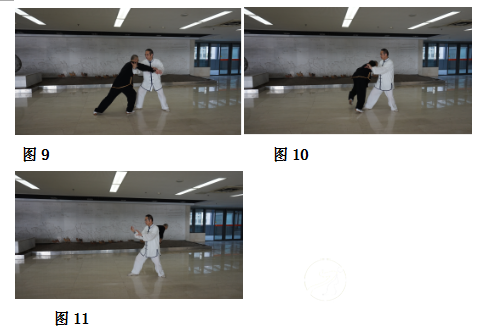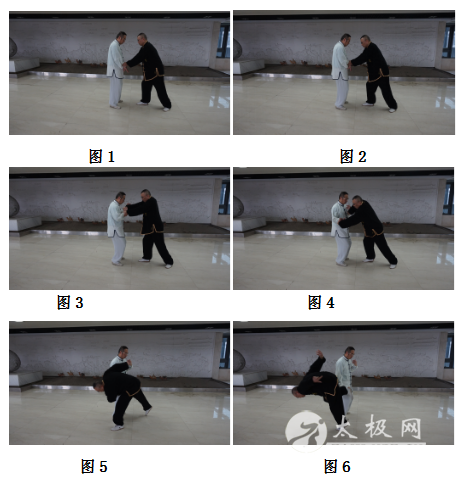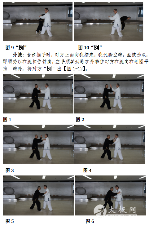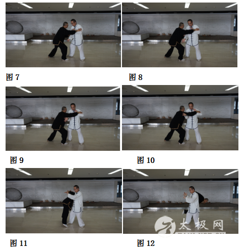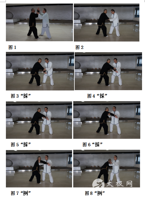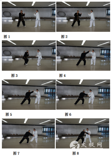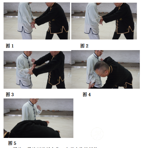 第一势:起势 概述:陈式太极拳起于“无极”,“心气一发,四肢皆动”,阴阳相生,虚实相济,动则成势,一势有一势之用,究其理法,无外乎“引进落空合即出”。陈式太极拳“起势”,发动走缓,缓而不滞,“丹田”承运,螺旋缠丝,折按、粘採、游挒,手挈劲伏,制敌于无形。其技势招术有二:提腕解抓;接手採挒。 招术一:提腕解抓 双方交触,对方(黑衣者,下同)恃力抓握我(白衣者,下同)双腕,我肘定位,折腕先收,再“掤”提梢左转,寓右先左引动之,遂立掌转腕,左手逆右手顺,“捋”缠其腕,沉胯,向右下“按”捺,对方腕关节被拿,负痛跌出【图1-6】。 下面组图是提腕解抓 近景【图1-5】 要诀:提腕沉胯肘定位,左引右旋梢领缠。 招术二:接手採挒 在合步推手中,划圈时或当对方向我按推时,皆可运用此法。此法有内接、外接之分,随劲路而变。 内接:双方搭手划圈,我缠绕其右手腕臂右手下左手内侧同时身左旋,右手滑动至肩臂扣住,左手在内擎住对方右手腕,沉腰转胯,两手合劲向右划圆平推,将对方“挒”出【图1-10】。 散手实战中,对方右拳向我头部或胸部击来,我右手顺缠外接手自右向左小圈,同时身左转左手搭其右手腕,右手滑动至肩臂扣住,左手在内擎住对方右手腕,沉腰转胯,两手合劲向右划圆平推,将对方“採挒”出【图1-11】 要诀:“採”分内外顺自然,“挒”抛在辅不在主。 太极运化,实分主手与辅手,两手开合,虚实相间,乃成败所系。如此招,右手为主手、为支点,左手为辅手走外圈平推、合劲,将对方“挒”出。若右手也不经意的往回带,则势必虚实不分,阴阳具失,出招即成败招,无如开门揖盗、作茧自缚,而“自为人制”,习练者不可不察也!