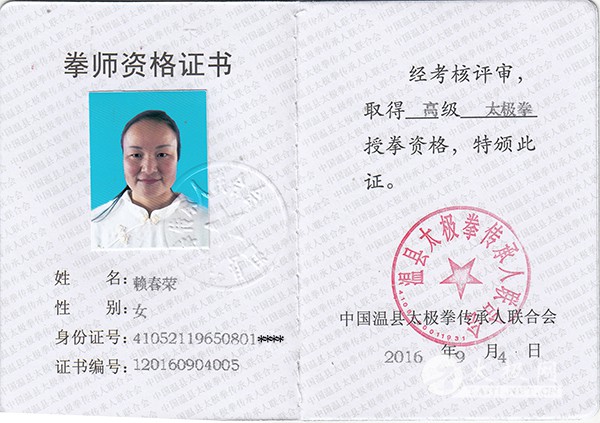 赖春荣,中国武术会员,郑州市武术协会会员,辅导员,二级拳师,国家体育指导员,中国武术五段。多次被评为优秀辅导员,优秀辅导站站长。 早期曾跟少林寺刘德友老师弟子李亚东学习长拳,散打,跟国家一级裁判赵春生学习长拳,跟民间老师学习众多武术套路,以取众家之长。 2004年在郑州文化公园跟刘书纯老师学习陈式太极拳,器械,学习陈式太极拳小架一路,二路,老架一路,二路,陈式单剑,推手,并帮助老师担任教练员,辅导员,起着骨干作用。 2005年在郑州市演武大会上获太极拳械第二名。 2006年10月在郑州市太极拳交流大赛中获42式拳,剑各第一名。 2007年在郑州市商行杯太极拳锦标赛中获集体拳术,器械各二等奖。2007年分别获两块银牌。 2009年10月在郑州市第七届运伟10月在河南省武协主席陈沛菊老师,开封市武协主席石磊老师和郑州市武协主任李伟,金水区武协主任陈兰英老师的见证下,举行了纪念陈鑫宗师诞辰160周年仪式上,拜刘书纯老师为师。 今后我一定勤学苦练,为传承和发展中华太极拳多做贡献。 |