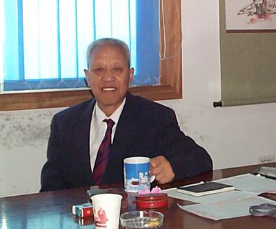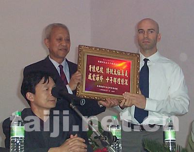 精神矍铄的太极大师陈庆州老师在办公室 美国弟子美国内功研究总会会长向老师赠送庆祝牌匾 |