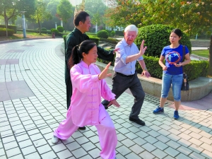 “洋徒弟”的太极拳情结说起与太极拳的渊源,已经退休的音乐教师Robinson用英文夹杂着半生不熟的中文缓缓说道,两年前在英国家乡,一次机缘巧合下,他对太极拳产生浓厚兴趣,“我觉得太极拳的动作很美又优雅,像是舞蹈一样。而我又喜欢跳舞,对我来讲,打太极拳就是慢速的舞蹈。”既然喜欢,Robinson自然也萌生了学习太极拳的想法,“最开始是跟着光碟学,后来在英国也有个老师教我,不过到铜陵来以后,我才发现铜陵的师傅更厉害。”说着Robinson向教他的太极拳武者汪永松竖起了大拇指,报以感激的微笑。而汪永松告诉记者,自己收下这个“洋徒弟”可谓是缘分使然,“前几天我在铜文化园广场上打太极,正好被Robinson看到了,当时他就表达了想学习的意愿,我也教了他一招。今天下午他要离开铜陵回英国了,所以临行前我准备多教他几个招式,让他回去慢慢学。” 起势、抱球……只见汪永松一边示范着标准动作,一边指点纠正Robinson,“我今天教的是杨氏太极拳里面简单基础的动作。”不过,即便不是门外汉,Robinson开始学的时候也显得有些手忙脚乱,同手同脚不知道怎么转换动作。“太难了!”Robinson不由得用中文抱怨道。不过汪永松却很有耐心,不断地指点纠正,而Robinson也渐入佳境,有了几分太极拳武者的模样。学习完太极拳后,另一名来自武术协会的武者还表演了一套春秋大刀,瘦弱的女子配上威风凛凛的大刀,别有一番英姿,行云流水却不失威猛刚劲的刀法看得Robinson目不转睛,“真是太棒了!” 从门外汉一路走来,Robinson在学习太极拳的过程中也遇到过不少困难,“对我来讲最难的就是转换手脚和保持平衡,不过今天老师教了我很多,我也慢慢学着克服这些困难。”作为音乐老师,Robinson坦言学习太极拳好处多多,为了自己的健康,再难也要坚持,“我常常要弹琴,弹久了肩膀很痛都抬不起来,学习太极拳正好可以缓解。” “铜陵文化让人印象深刻” 作为市十二中的国际交流学校———英国哈尔顿市维德迪康学校的前联络人,Robinson对铜陵有着不一般的情感,“我是一名音乐老师,以前就来到铜陵进行过校际交流,也在铜陵交了很多朋友,结下了深厚的友谊。”退休后,Robinson再次应市十二中友人的邀请来到铜陵,此次更是在友人的带领下游遍了铜陵的大好山水。 “我去了老洲,听了王晓梅老师唱的《铜陵牛歌》,去了西湖湿地公园、铜陵博物馆,还去了犁桥村,哇!真是太美了!”扳着指头,Robinson一一道来,“铜陵的文化很丰富,而且风景也很美,你们身在这个城市可能会忽略,但对我来说,印象太深刻了,我想我会永远记得这个美丽的城市,有机会一定会再来!”(来源:铜陵日报 作者:钟灏) |