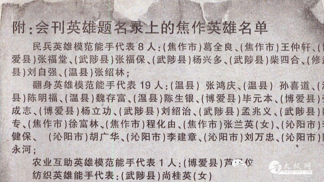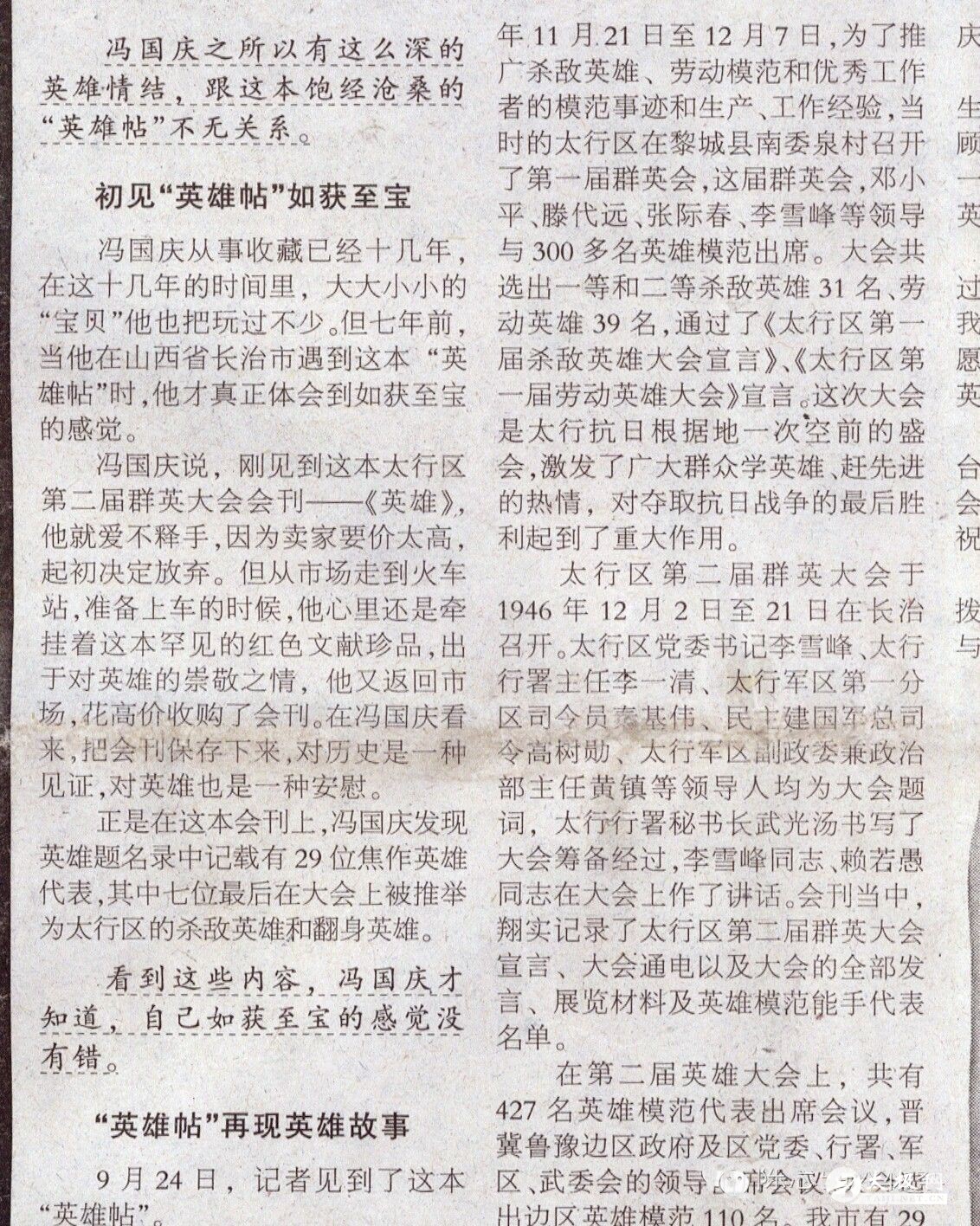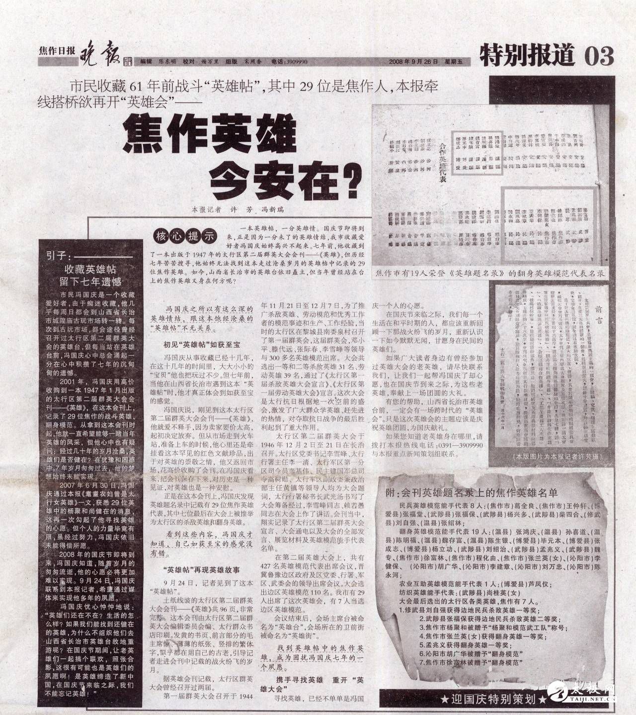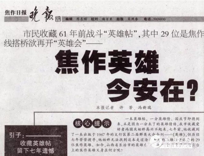 | 2008年9月26日,焦作晚报,第3版登载,标题为:《焦作英雄今何在》?寻找61年前战斗“英雄帖”中记录的29位焦作英雄。 1946年12月2日至21日,太行区(由晋冀豫3个省组成,管辖8个专区)第二届群英大会在长治召开。太行区党委书记李雪峰等领导和427名英雄模范代表参加本次大会,温县陈家沟陈生银作为《翻身英雄模范能手》代表出席,并荣登《英雄题名录》。 第一届群英大会是1944年11月21日至12月7日在黎城召开,邓小平等领导和300多名英雄模范出席了大会。 陈生银:太极拳发源地陈家沟第一任党支部书记