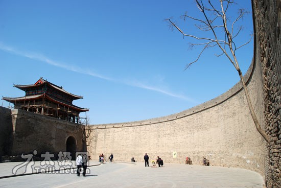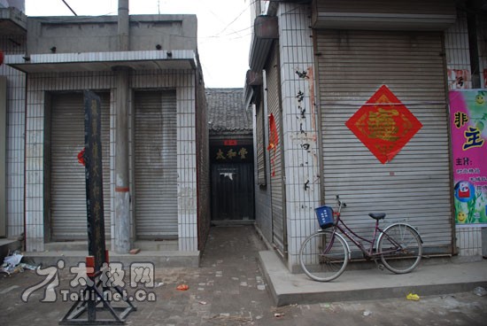 略显一丝寒意的护城河水 广府南门远眺 早春里的重重青瓦和开始泛绿的树木 [page] 五、夹缝中的太和堂 太和堂,在太极拳史上有着举足轻重的地位,它承载和见证着太极拳从温县到永年,走向世界的历史。文革期间,太和堂响应拓街号召,后退数米,但上世纪八十年代,太和堂后退数米的门前空地被卖掉,矗立在太和堂门口两边的两间门面,只给它留下一条狭长不足两米的过道,就这样,闻名遐迩的太和堂在夹缝中艰难存活。。。