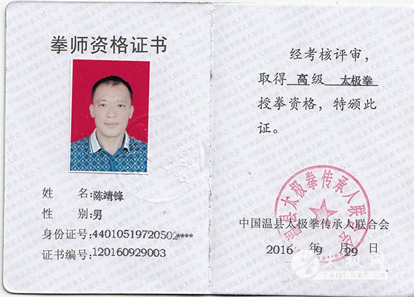 陈靖锋,陈家沟陈氏十九世太极拳嫡宗传人、太极拳“八大天王”之一陈志强老师入室弟子。生于1972年、广州市白云区人、国家二级武术裁判、国家社会体育指导员、陈家沟太极拳研究会副秘书长、广州市花都区陈氏太极拳协会副会长。 2014年10月,国家武术管理中心、中国武术协会主办的全国武术太极拳公开赛获得陈氏太极拳银牌、陈氏太极春秋大刀银牌。 2015年8月,广东省传统武术锦标赛获得陈氏太极单刀金牌、陈氏太极春秋大刀金牌、陈氏太极拳金牌。 2015年10月,国家武术管理中心、中国武术协会主办的全国武术太极拳公开赛获得陈氏太极拳金牌、陈氏太极春秋大刀金牌。 |