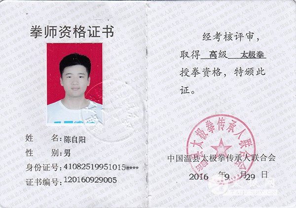陈自阳,陈家沟陈氏十九世太极拳嫡宗传人、太极拳“八大天王”之一陈志强老师入室弟子。生于1995年,河南省陈家沟人,受村里太极拳气氛的熏陶,从入学起,就开始接触习练太极拳,每逢假期,都会在村里的武校受到专业的培训。 现为国家一级社会体育指导员、国家二级武术裁判、一级拳师、陈家沟太极拳研究会副秘书长、广州市陈志强太极拳推广中心主教练、山东郯城县文化馆特聘馆外太极拳辅导员。 曾连续三年获得广东省传统武术锦标赛陈氏太极春秋大刀金牌。 2012年8月广东省传统武术锦标赛获得传统陈氏太极剑金牌。 2013年8月广东省传统武术锦标赛获得传统陈氏太极拳金牌、陈氏太极剑金牌、陈氏太极春秋大刀金牌。 10月被聘为广州市花都区第四届老年人运动会太极拳比赛裁判员。 2014年8月广东省武术锦标赛获得陈氏太极春秋大刀金牌。 2015年6月首届“梦真杯”广府武术文化节暨推手争霸赛获得75公斤级推手冠军。 2015年8月广东省传统武术锦标赛获得陈氏太极拳金牌、陈氏太极春秋大刀金牌。 2015年8月8日广东(广州)第十一届体育节太极拳推手赛获得75公斤级推手亚军(师兄弟包揽本届推手比赛全部冠军)。 2016年5月首届清远“顺盈杯”广东省陈氏太极拳精英赛荣获“优秀裁判员”称号。 |