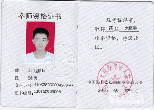 程相炜,陈家沟陈氏十九世太极拳嫡宗传人、太极拳“八大天王”之一陈志强老师入室弟子。生于2000年,河南省温县人,国家一级社会体育指导员、国家二级武术裁判、一级拳师、陈家沟太极拳研究会副秘书长、广州市花都区陈氏太极拳协会副会长、广州市陈志强太极拳推广中心主教练。 2016年5月广东省陈氏太极拳精英赛获得陈氏太极拳金牌、陈氏太极刀金牌。 2016年5月21日广东(广州)“创尔生物杯”推手赛获得60公斤级推手冠军。 2016年7月广东省第九届武术精英赛获得陈氏太极拳、陈氏太极单刀、集体项目等3枚金牌。 2016年8月第六届世界太极拳健康大会获得陈氏太极拳金牌。 |