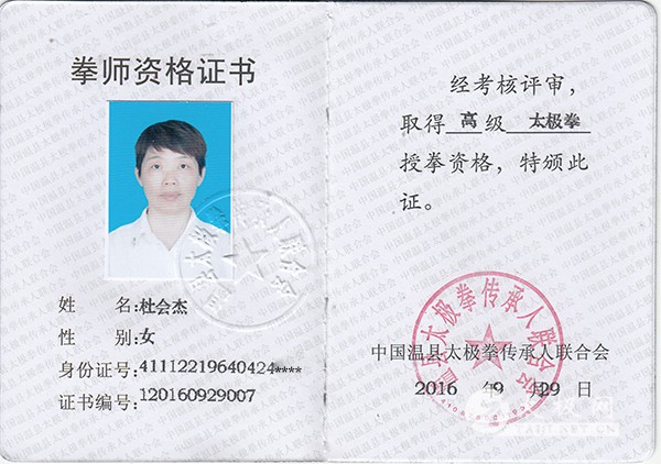 杜会杰,女,1964.3出生,河南省漯河市临颍县人,2006年在深圳龙岗居住,2012年随家人定居深圳市坪山新区大东城嘉宏湾花园。大学文化,退休教师。中国武术协会会员,广东省武术协会会员,深圳市太极拳研究会常务理事(主管深圳龙岗区,坪山新区的太极拳发展事业),深圳市陈志强太极养生俱乐部总教练,深圳市坪山新区太极拳协会会长兼总教练,中国武术六段,国家一级社会体育指导员,一级教练,太极拳名师。本人练拳近二十年,师承陈家沟陈氏太极拳十九世嫡宗传人陈志强。2005年开始教拳,所带弟子众多,在深圳龙岗区,坪山新区有口皆碑。2013年在坪山成立太极队伍,大力推动了坪山新区陈式太极拳的发展,受到政府和社会大众的好评,为此被评为深圳市坪山新区十佳现代市民,坪山新区最美家庭, 2009年深圳市第十一届传统武术精英赛个人陈式太极拳金奖 2010年深圳市第十二届传统武术精英赛个人42式太极拳金奖,42太极剑银奖 2011年深圳市第十三 届传统武术精英赛集体陈式拳一等奖 2012.8月,广东省武术精英大赛太极功夫扇金奖。 2014年所带学员参加广东省第七届武术精英赛获得四个金奖,考取四个四段位。 2014年8月深圳市第十六届传统武术精英赛坪山太极拳协会获集体陈式春秋大刀第二名,二个学员参赛个人取得二个第一名,一个第二名,一个优胜奖。集体陈式太极拳一等奖 2015年5月9日深圳市太极拳研究会千人舞太极交流活动集体第一名 2015年8月,个人获广东省武术精英大赛陈式太极拳金奖 2015年4月,深圳市老干部太极拳交流赛,集体陈式太极拳第一名。 |