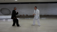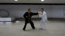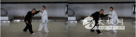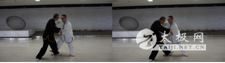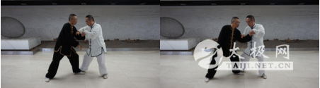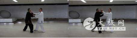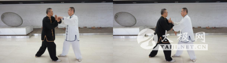 招术二,浪遏飞舟 合步推手,划圈打轮,对方挤掤,我吞化对方掤劲,左挈右捋将对方“引进”,对方为稳固身形倏然回撤,我旋即沉胯,胸腰折叠,右腕转关,折出凸击,劲出似浪头拍岸,将对方发出。所谓“轻抹如同弓上箭,放开亦似箭离弦”【图2-1至图2-12】。 图2-1 图2-2 图2-3 图2-4 图2-5 图2-6 图2-7 图2-8
