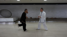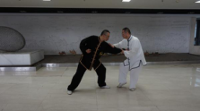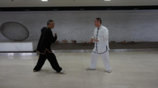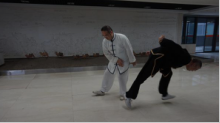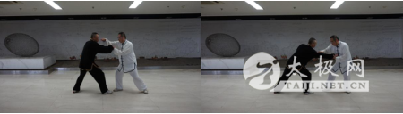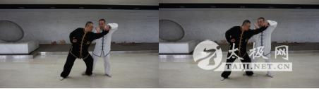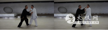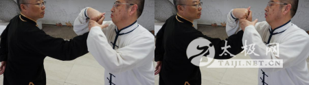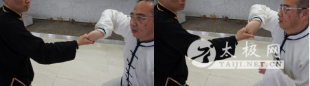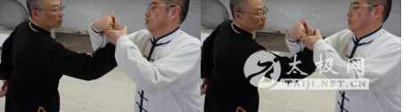 招术三,疾风断枝 合步推手,划圈打轮,彼以按来,我挤化续上掤引,左手转腕扣握其右腕,右掌根贴其肘弯处,走横圆螺旋,向下划弧,三节分家瞬猛双按下採,使对方跌扑或脱臼。所谓“疾风劲吹平静时,不静不见断其枝”【图3-1至图3-8】。(注意,只可小臂和手腕瞬间下採劲,大臂和肩不可用力) 图3-1 图3-2 图3-3 图3-4 图3-5 图3-6 图3-7 图3-8