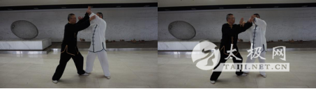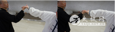 图3-17 要诀:出手右掌贴臂弯,横旋再接下按採。
