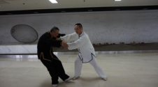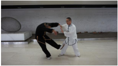招术四、送客楚门 合步推手,划圈打轮,彼以按来,我挤化续上掤引,左手转腕扣握其左腕,右掌根贴其肘弯处,走横圆螺旋向下微划弧,随即右掌顺缠上挑捋,同时沉胯左转大臂与肩粘其左肩臂处,上下合劲猛左旋,“靠”击对方肩关节致疼痛。所谓“阴阳开合运行好,迎来送往顺达了”【图4-1至图4-9】。 图4-1 图4-2 图4-3 图4-4 图4-5 图4-6 图4-7 图4-8 图4-9 散手实战中,对方左直拳当胸袭来,我双手迎锋接其来脉,左手转腕扣握其左腕,右掌根贴其肘弯处,走横圆螺旋向下微划弧,随即右掌顺缠上挑捋,同时沉胯左转大臂与肩粘其左大臂肩处,上下合劲猛左旋,“靠”击对方肩关节致疼痛而出【图4-10至图4-24】。 图4-10 图4-11 图4-12 图4-13 图4-14 图4-15 图4-16 图4-17 图4-18 图4-19