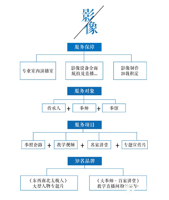 七、太极网·影像服务 1、专业服务与推广 大拳师全媒体工作室依托于太极网资源创建,从整体策划推广方案到影像服务,从拳师、拳馆形象包装到个人或团队品牌打造,建立了完善的服务体系,致力于为全球太极拳传承人、拳师、拳馆提供全方位、专业的宣传推广服务。 2、专业的影像制作团队及设备 3、品牌影像节目 ① 《东南西北太极人》大型系列专题品牌,曾推出过陈全忠、范鸿信、朱老虎、李树发、孙建国等诸多名家大师的系列专题片。 ② 太极网·大拳师学院直播间粉丝55万+,为各流派太极拳名师名家与全球拳友搭建在线教学直播互动平台。 ③ 入目三分见太极、大拳师·敢问敢答、太极网名师问答等栏目通过太极网微信平台服务全球拳友。