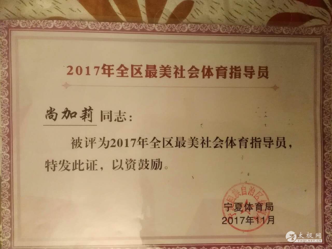 2017年全国太极拳邀请赛(贺兰赛区)带领学员获得集体一等奖(陈式老架一路);2017年5月10日,太极网银川分站正式挂牌成立,尚加莉任分站站长。
