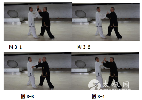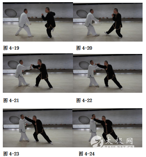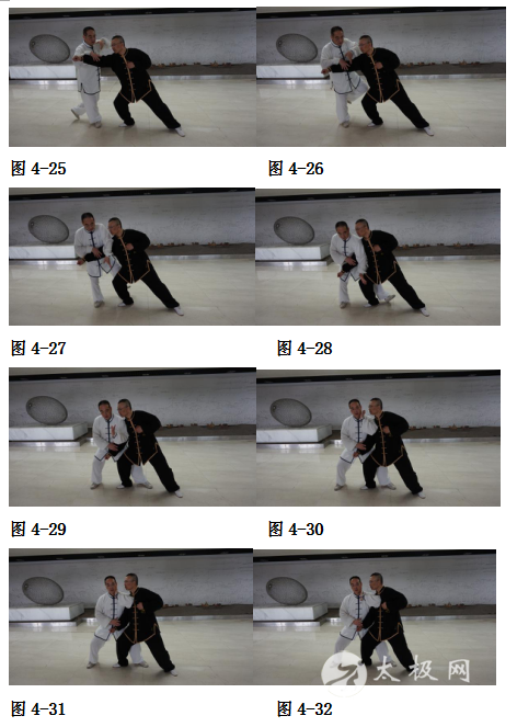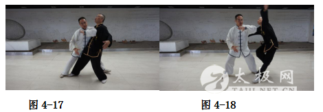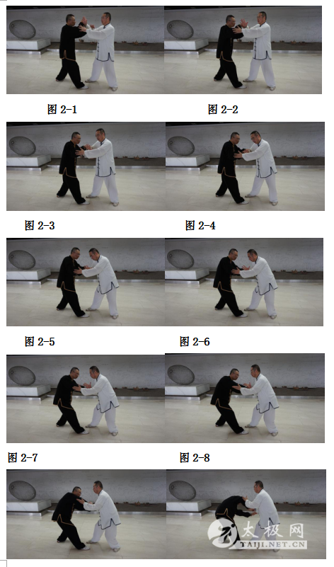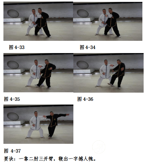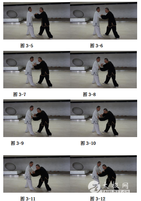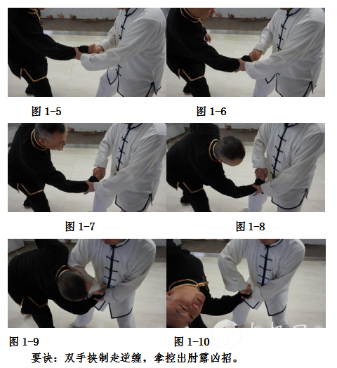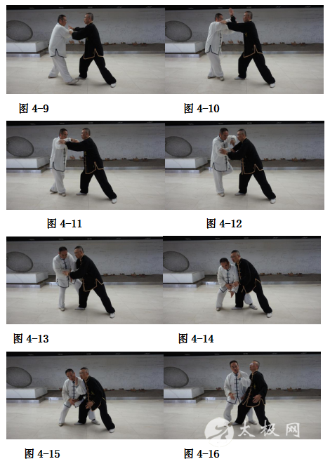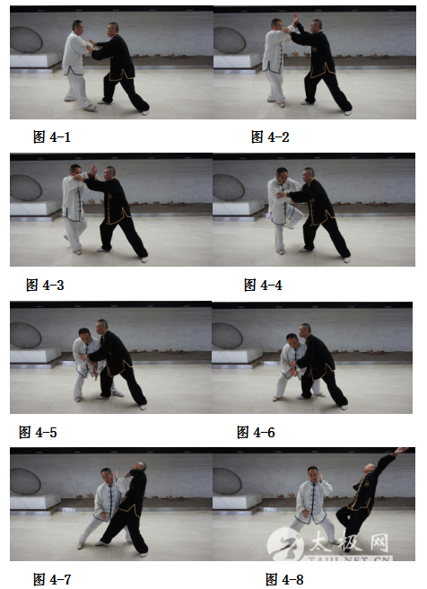 招术一,先礼后兵 旧时,国人相见礼节为双方抱拳施礼。19世纪末西风渐进,握手礼成行。武林之人相见行握手礼时,对方手掌使劲、使招以试我之功夫或挑衅我,为此,“单鞭”之“万法礼祖”解之。 双方右手相握,对方突加力握拿,我即左手挟其右腕,左右双逆缠(似拧毛巾状)右手上折合劲,同时左转;对方手腕被折拿身体右倾跌进,我顺势右肘迎击其首。这叫“前打一丈不为远,近打只在一寸间”【图1-1至图1-10】。 招术二,老僧托钵 合步推手,划圈打轮,对方双手紧抓我右小臂,恃力推按。我沉胯、含胸、收腹,右手梢节领劲顺缠化引,必致其身形左倾,趁时右手下引,胯右转,同时左手托其右肘翻其肘,对方失重跌出。所谓“阴阳开合妙入微,一汪池塘凭鱼飞”【图2-1至图2-12】。 招术三、白马翻蹄 合步推手,划圈打轮,对方双手突抓我右小臂,恃力推按。我沉胯微右转,双手顺缠,左进右撤相搓,稍挫其锐,左手顺势反勾其左腕下挂使我右手得脱,旋向右划弧凸腕击其左面颊。真是“回转诸势来不及,惟用翻蹄最适宜”【图3-1至图3-18】。 招术四,苏武挥鞭 推手中, 此招术可分肩靠和肘击两种用法。 1、肩靠 合步推手,划圈打轮,调整右步上左步,以己左胯制住对方右后侧胯,占据要津,阻其后撤,右手拿住对方右腕,左手“以手领身”,粘其右臂沉肘逆缠,微右旋俯而下引,时已得机,遂左手顺缠竖掌引肩“靠”击。所谓“弓弦一卸屈而张,一缕中气随势扬”【图4-1至图4-8】。 2、肘击 合步推手,划圈打轮,调整右步上左步,以己左胯制住对方右后侧胯,占据要津,阻其后撤,右手拿住对方右腕,左手“以手领身”,粘其右臂沉肘逆缠,微右旋俯而下引;时已得机,遂左转肘击。所谓“三节钢鞭肩肘手,随机应变向外走”【图4-9至图4-18】。 散手实战中,对方疾拳直冲,我右手走逆缠接,同时上左步,以己左胯据对方右后侧胯,右手粘住对方右腕,左手“以手领身”,粘其右臂,微右旋俯而下引,时已得机,遂左手顺缠竖掌引肩靠,一击!左手逆缠接肘击,再击!左手继逆缠领劲开臂,将对方“跌空合出”,三击【图4-19至图4-37】。 “单鞭”一势的招法紧凑、跌宕,步法与身法相辅协动,“以手领劲”,迭施有序,“引”而后发;虽言“感而后应”,我亦先声夺人,出招有取胜之法,锋镝即指,伏而莫纵。 责任编辑:太极网孔春红 |