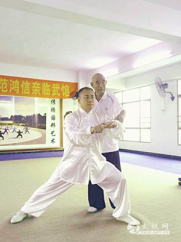 习练太极拳让张辉的精神世界更加丰富,而身体的健康也是一方面收获。除此之外,在传播太极拳的过程中,张辉和众多太极拳爱好者们相互交流、切磋,拓宽了他的交际圈和人脉关系网,随着近年来国家大力支持太极拳的发展,已经有越来越来的人加入到习练太极拳的行列中来,“太极拳”也成了张辉与人结识的最方便的“敲门砖”。 张辉在第二届国际太极拳网络视频大赛颁奖典礼现场 张辉说,他非常感激自己的师父范鸿信大师,是他带领自己走上了太极之路,也是他教会了自己如何感悟太极,通过对太极拳不断的习练和对太极拳文化的理解的加深,张辉越来越明白,中华武术的最高境界是爱,“武”意在止戈,用兼爱非攻的思想和感恩的心去做人、去处事,就会感受到这个社会是多么的和谐,会让人更加的热爱生活,也会感觉整个世界充满了阳光、充满活力、充满希望! 张辉与范鸿信大师 范鸿信大师为人低调,谦虚平和,据张辉回忆,他老人家做人非常谦虚,从来不以大师自居,更不会评论别家派系。他说:无论哪门哪派的武术,概括起来都是中华武术,是前辈留给后人的宝贵财富,是不可或缺的宝贝,你们要做到:不利于团结的话不说,不利于团结的事不做!师父的话语重心长,张辉始终都告诫自己不可忘记。师父的武德让张辉敬佩不已,特赋诗一首,略表敬意: 太极老人范鸿信 立身中正在武林 年近九十不言老