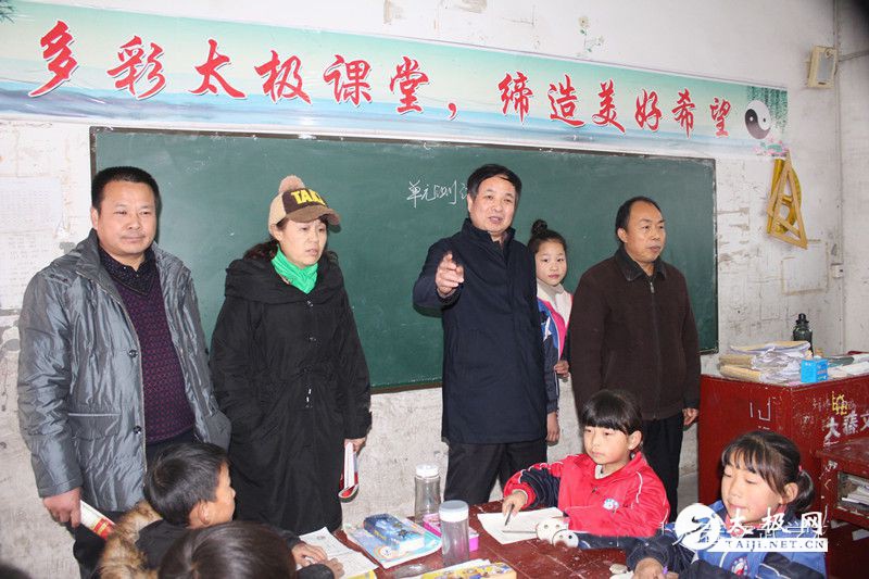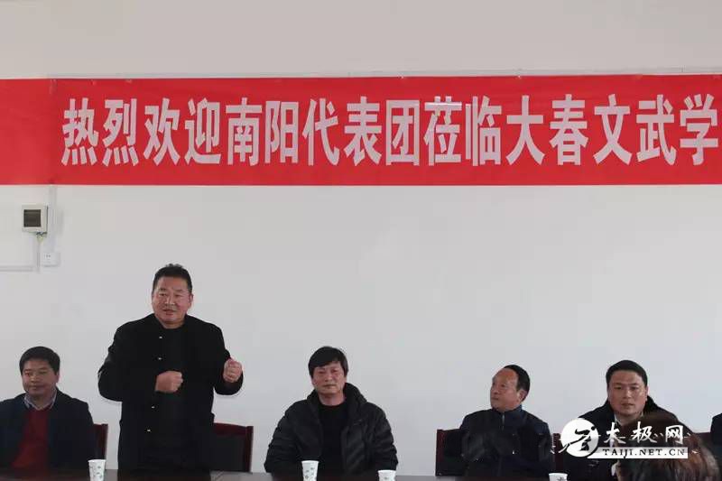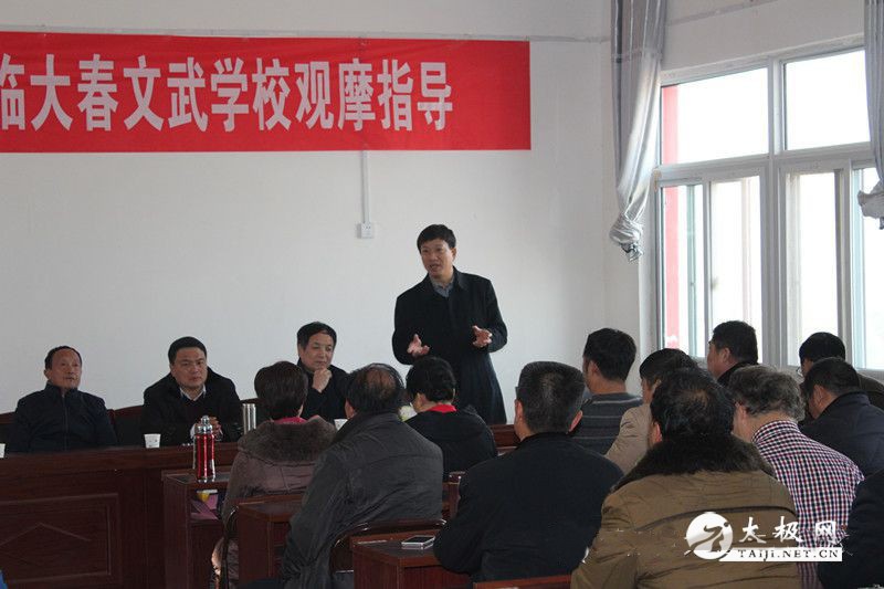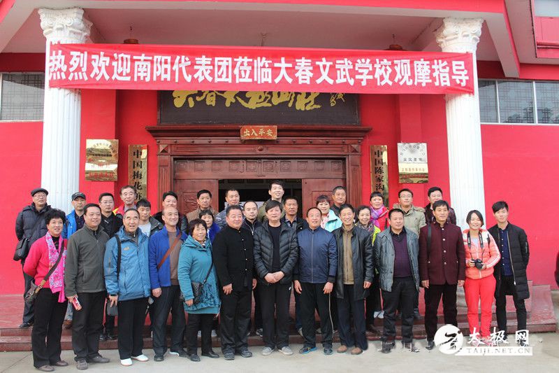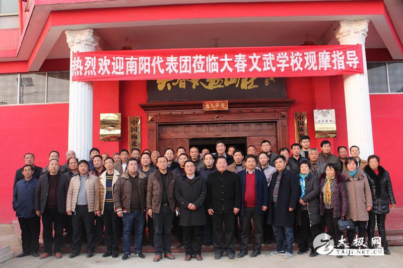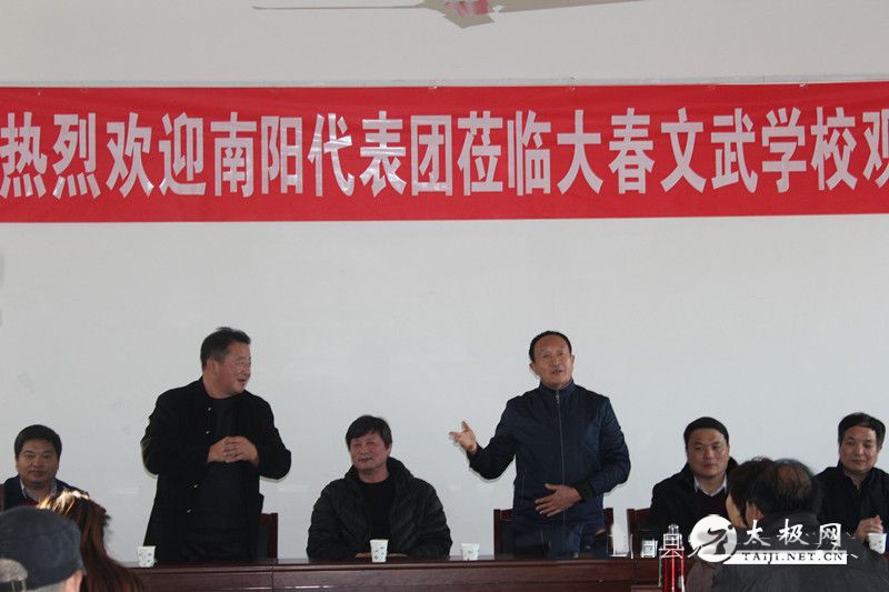 随后考察团一行来到学校运动场,正阳县大春文武学校的学生们正在表演太极拳,棚、捋、挤、按学生打的有模有样,迎来参观团一片掌声,纷纷用手机记录下精彩瞬间,看完大课间董事长王大春对孩子们的表演给予的现场指导,并鼓励好着们一定要多练毅力、多练精气神。随后大家来动武术馆,大春文武学校的学生们为考察团上演了《水韵太极》大型武术节目,太极单刀、太极单剑、春秋大刀等节目精彩纷呈,把参观活动推向了高潮,掌声响彻场馆内外。 王大春董事长致欢迎辞 孙群杰校长介绍大春文武学校办学特色 南阳市武术协会主席 高东祥 致辞 随后在考察团在正阳县大春学校会议室召开了座谈会。座谈会上,王大春董事长首先对南阳市考察团的到来表示热烈的欢迎,并对大春文武学校“育人“”明理”的办学理念进行了介绍。董事长结合自己的“太极情怀”谈及太极山庄和大春文武学校的办学历史,“作为全国最大的太极拳品牌学校,我们从办学开始,就尤其注重对孩子育人理念的教育,重孝道、明长幼。孩子们在大春文武学校学学习太极拳、诵读国学经典,强健体魄的同时还很好的弘扬了太极文化,传承了我们的国学经典。孩子们懂孝道,老师们更是身先垂范,我们大春文武学校的教师们成立了爱心基金用实际行动来孝敬父母。” 孙群杰校长结合学校“太极品牌”、“国学经典”、“太极课堂”三大办学特色进行详尽介绍,“大春文武学校很好的解决了文武特色的相结合,学生们通过练习太极拳不仅强壮了身体,更重要的是锻炼了意志力。走在我们的校园里很难发现有戴眼镜的同学;并且每逢感冒流行季节,很少有学生感冒,练太极,身体棒棒的;文化课上我们实施国家标准九年义务教育,并且我们把国学经典《论语》列入了课程,走在了教育部倡导的“国学进校园”实践中的前列,孩子们见人就打招呼、问好,总是那么彬彬有礼;学校还成功的把太极拳理念与前言教学改革相结合,创造性的实施了课改新范式——“太极课堂”,自主学习、探究合作成功开创了课程改革的新模式。“ 最后,考察团团长、南阳市武术协会主席高东祥同志代表100多名考察团同志做了总结性发言,他强调:”正阳县大春文武学校在董事长王大春的带领下、在以孙群杰校长为首的优秀团队感召下学校在太极拳品牌、国学经典传承、新课改模式中都取得了卓越的成绩,我们今天看到了大春文武学校学生们的精气劲头,传统武术在这里践行、传统国学经典在这里传承,我们今天的考察真是两个字”值得“,考察回去后我们会把咱们学校文武兼修的教育教学经验更好的运用到南阳教育上去,让”大春文武学校“式的学校在南阳繁花盛开,结出累累硕果。” 考察团考察大春文武学校课改范式——“太极课堂” 王大春董事长同南阳市考察团合影留念 考察活动圆满完成
