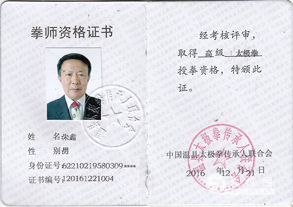 朱鑫,甘肃敦煌人,出生于1958年3月现为甘肃省太极拳协会敦煌辅导中心主任,2级社会体育指导员。自幼喜欢武术,在敦煌中学上学期间就参加了学校武术队,学习了初级长拳,初级刀,初级剑。1977年考入酒泉师范学校,跟蔣永革学习了少林查拳,翻子拳,后来师从吴式太极拳第四代叶多福学习吴式太极拳。后来又系统学习了杨式24式,48式,42式太极拳,32式太极剑,42式太极剑,武当太极剑和传统杨氏85式太极拳。2010年在杭州学习了陈式太极拳56式,老架一路等套路,2016年6月参加了杭州传统武术邀请赛,拐杖获得一等奖,陈式传统套路获得2等奖,48式太极拳获得2等奖。2016年9月起,师从陈式太极拳12代刘建华系统学习陈式太极拳。 |
