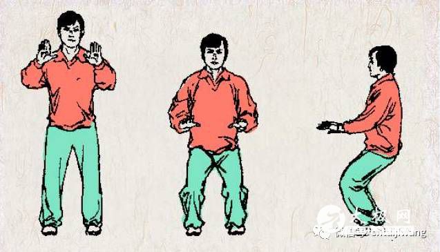 其动作姿势,在心静体松下,小开步,躯干正直。两臂前平举与肩同高,手心向下指向前,沉肩、垂肘、坐腕、舒指。头上顶、眼平视。两腿慢慢屈蹲,两膝不可外撇;要向内收并圆裆。要求膝尖垂直投影向前不可越过该腿的脚尖,大腿极限位置与水平线平行,即不可低于水平线。自然呼吸。慢慢起身后,两臂还原。