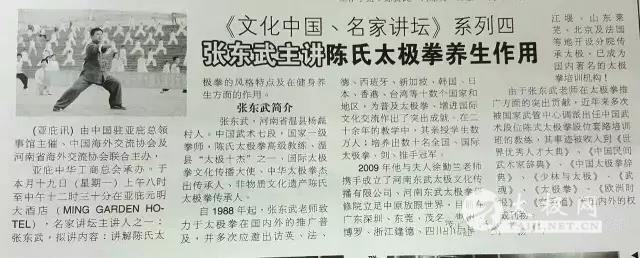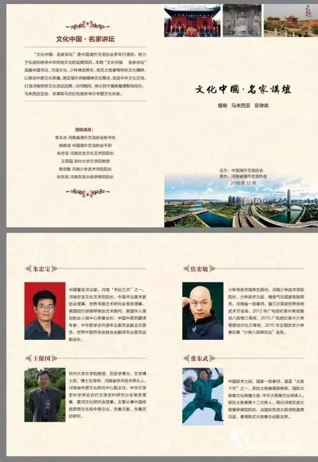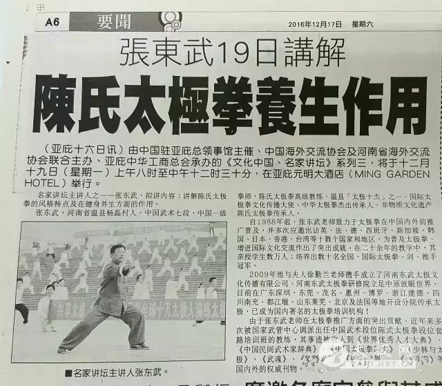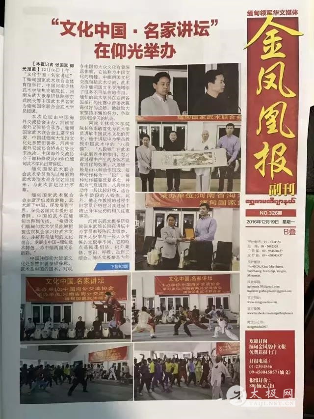 (太极网报道)在由国务院侨办、中国海外交流协会主办,河南省对外交流协会承办的“文化中国·名家讲坛”活动中,由温县体育局委派,陈式太极拳名师、河南东武太极研修院院长张东武老师作为中原文化的四位杰出代表之一,于2016年12月13日至24日间,出访了东南亚三国五地,为华人华侨了解祖国的传统文化、加强祖国与东南亚各国的文化交流起到了积极的作用。 张东武 12月15日,张东武老师的第一场讲座在缅甸曼德勒的金多堰大礼堂隆重举行,曼德勒华社华校100余人参加了该活动。张老师刚柔并济的太极拳演示让与会观众看的目眩神弛,刷新了大家对太极拳的认知。张老师的讲座不仅让大家更多地了解了太极拳的健身功能,也使得大家对太极拳的技击功能有了全新的认识。演讲结束之后,昌华国际学院昌华中文学校吴和平先生题诗一首,盛赞“文化中国访缅甸,名家讲坛不虚传”。 12月16日,张老师的第二场讲座在缅甸国家武术联合会开讲。缅甸武术联合会是国家军方储备人才及国家武术专业队员的重要训练基地,缅甸国家武术联合会李伯波会长、中国驻缅甸大使馆文化参赞田善亭先生出席了该活动。张老师的精彩演讲引起阵阵喝彩,在会议现场掀起一阵热情的太极狂潮。 张东武授课 12月19号,张老师在马来西亚沙巴州首府亚庇市举办了第三场讲座。中国驻沙巴总领事馆总领事陈佩洁女士、沙巴州亚庇中华工商总会会长、拿督雷远生先生、拿督刘顺泰等当地政要和华人华侨领袖及一百多位中国文化爱好者参加了本次活动,马来西亚的华侨们惊叹于张东武老师的演讲和展示,纷纷表示强烈期待张东武老师再赴马来西亚传授陈氏太极拳。 张东武教拳 12月20号下午,张东武老师的第四场讲座在菲律宾马尼拉商总七楼会议室举行。菲律宾华联谊会理事长陈文辉、名誉理事长杨思育,秘书长王宏忠,外交主任王利民等专程到机场迎接张老师的到来;12月21日,张老师的最后一站在菲律宾宿务室举行,中国驻宿务总领事馆领事施泳,菲华联谊总会陈文辉理事长,原菲律宾外交部副部长,菲律宾驻华大使馆周清琪大使及宿务各侨界人士参加了这次活动。热情的观众除了对张老师的拳艺表达敬佩之外,还纷纷表达了学习陈氏太极拳的意愿。 张东武老师圆满完成了此次出访东南亚三国五地的任务,将陈氏太极拳的风采广布四方,增加了当地华人华侨对祖国传统文化的了解。“名家讲坛”是国侨办组织的一项旨在跨进国家间文化交流的明星项目,这是河南省第四次受国侨办委托承办该活动,充分说明了国侨办对河南省侨务工作的认可和肯定,更彰显出中原文化的厚重魅力和对海外侨界的吸引力。正如河南省海外交流协会秘书长李冰冰所言,文化中国名家讲坛能弘扬中华传统文化,满足海外侨胞对中华文化的精神需要。 各路媒体争相报道张东武东南亚之行 本站编辑:太极网陈超 |