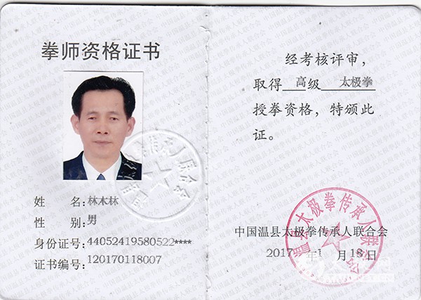 林木林,1976年-1988年拜师习练广东南拳、蔡李佛拳、南岐拳,1988年-2000年拜师习练峨眉气功、铁布衫、金钟罩,2001年-2005年习练杨式太极拳,2005年-2016年跟随陈式太极拳二十世第十二代传人王希富老师习练陈式太极拳。1989年-2004年授南拳、蔡李佛拳,2005年-2008年授杨式太极拳,2009年-2016年授陈式太极拳。普宁(粤东)陈式太极拳协会理事,粤东(普宁)王西安拳法研究会理事。 |
