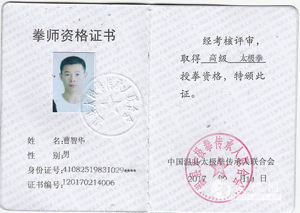 曹智华1983年出生于河南温县陈家沟东邻辛堂村,陈氏太极拳第十一代传人。自幼起随父曹二柱先生习练陈氏太极拳秘传功夫架、太极推手、散手等功夫。深得其父真传。2003年携技入伍。在部队服役期间、思想强、作风硬,屡屡立功受奖。以拳艺精湛、功力独道的太极技击使连队官兵所折服。在部队工作8年,时刻不忘父训,每天练习太极拳。使广大官兵对太极拳直观的了解。退伍后发扬不怕苦不怕累的顽强作风,使自己的功夫进一步的提高。现任温县曹二柱太极功夫院总教练。多年来的练习经验使其对太极拳的教学及理论研究具有独特的见解。太极拳年轻杰出代表人物之一;以弘扬中国传统文化、发扬光大太极拳为己任,对太极拳推广事业做出了积极的贡献。 拳照 |