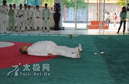 吸气,呼气,平躺,肚子突然变大,“嘭”的一声,放在王战军肚脐处的铜块被弹出1米多远。 27号上午,第八届“网上看河南”采风团来到焦作温县,该县陈家沟武术院总教练王战军表演的“丹田盘抖”神功,让全国网媒的记者朋友大开眼界。 今年36岁的王战军是陈家沟本地人,6岁起开始练拳,练太极绝学“丹田盘抖”已有15年时间。 “长期练太极,体内会产生一股真气,‘丹田盘抖’就是将这股真气运行到丹田部位,突然发力,弹走重物。”王战军说,去年12月,他将两公斤重物弹出98厘米,创造了吉尼斯世界记录。 今年年初,他已经这个记录打破,如今,他能将10公斤重的物体,弹出1米远。 |
