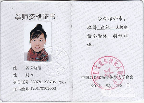 朱晓莲,1987年出生,成长于人文荟萃的中国传统文化古村——浙江兰溪诸葛八卦村。在浓郁的传统文化氛围的熏陶下,热爱太极拳,希望把太极国粹与现代的健身,美,时尚结合起来。2015年拜解礼德先生为师,习练尊古陈氏太极拳。