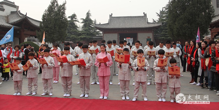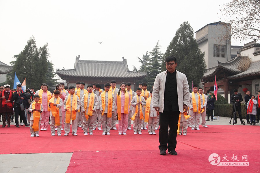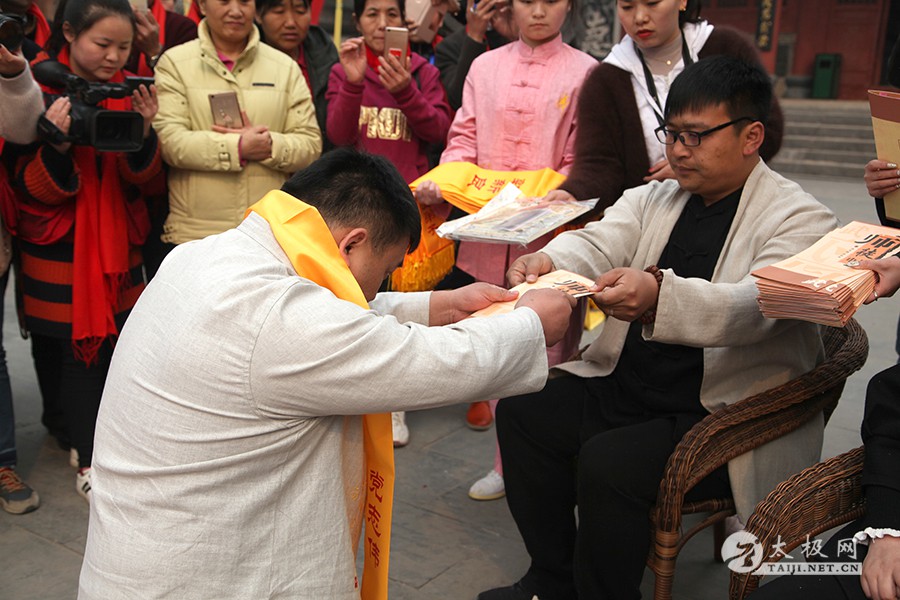 收徒仪式 新入门弟子依次上前向师父陈三虎老师递交拜师贴,师父回帖并为弟子披挂绶带颁发入门证书。随后,陈三虎老师带领新入门弟子向太极拳始祖陈王廷行礼,新弟子向始祖敬香行礼,至此收徒仪式圆满礼成。陈三虎老师向新弟子训话,希望他们能够恪守门规祖训,认真习练太极拳,将太极拳发扬光大。新弟子代表张轶发表入门感言,他表示将会谨遵师父教诲,以传承和发扬太极拳为己任,三生有幸遇良师,今朝一拜终圆梦,感谢师父教导和指引,在以后的习拳道路上他会更加刻苦努力,一定不会辜负师父的希望与厚爱。