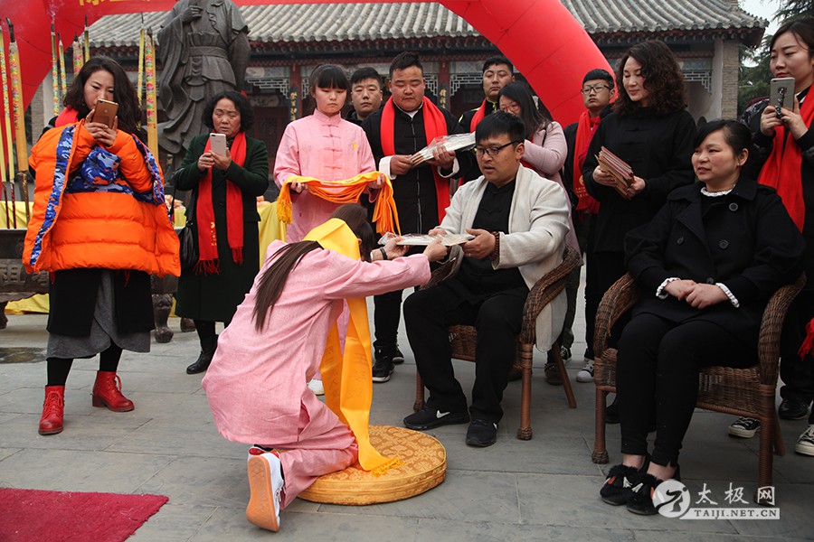 参加收徒仪式的嘉宾有:温县景区管理局副局长任海林,温县体育局武术科科长万金良,陈家沟太极拳发展有限公司总经理张胜利先生,温县太极拳文化管理中心事业部、培训部负责人范晓涛先生,菏泽中级法院执行局局长张效歉等。