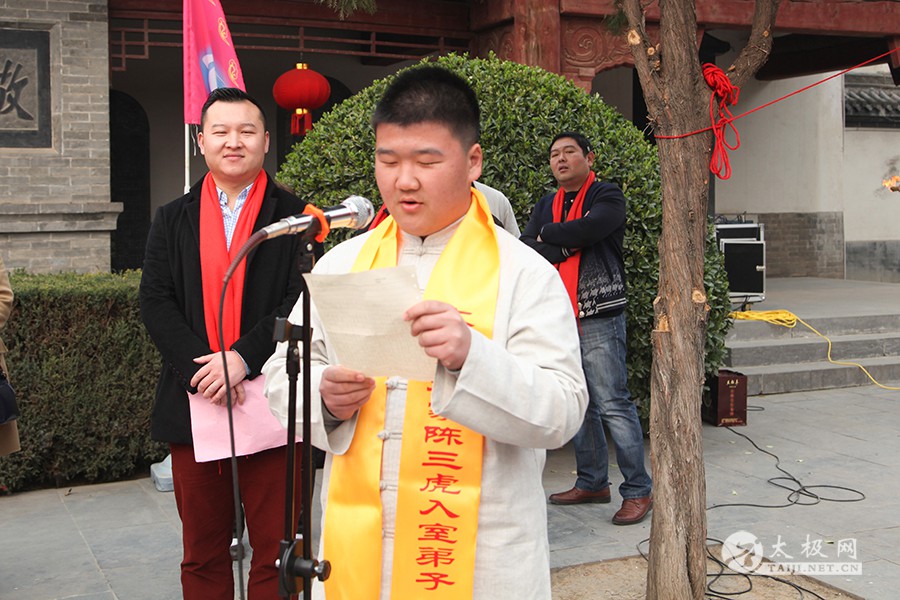 张轶发表感言 拜师仪式结束后,任海林、陈大虎、陈景安等纷纷致辞,恭喜陈三虎老师今日喜收新徒,为陈式太极拳注入更多的新鲜血液,为太极拳的发展又做出了极大的贡献。同时,向今天拜入陈三虎老师门下的弟子表示祝贺,希望弟子们恪守太极拳门规祖训,谨遵陈三虎老师教诲,为太极拳的发展和太极文化的传播作出贡献。