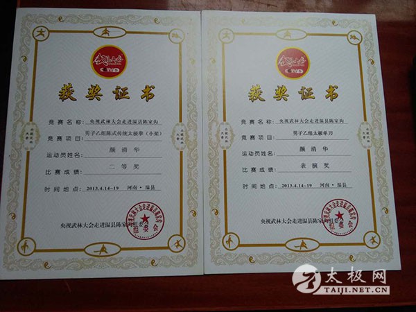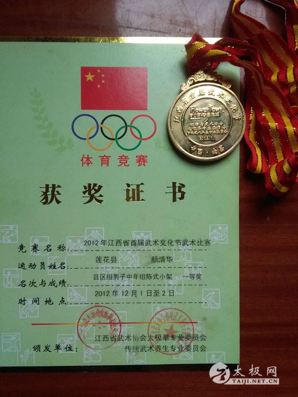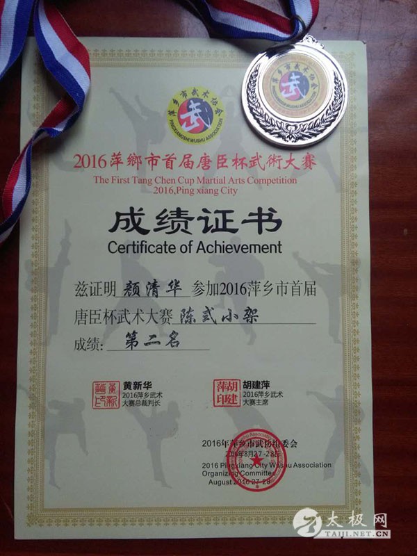 陈式太极拳小架一层架 颜清华,男,1962年10月出生,江西省莲花县人,大学本科。自幼随父习练岳家拳,曾习练峨眉铁砂掌和少林易筋经,后拜河南温县陈家沟陈氏太极拳第十一代正宗传人陈春生先生为师,专练陈氏太极拳小架,并得到师爷陈伯祥先生指点,深得陈氏太极拳小架拳理和功法,拳架纯正。现为温县陈氏太极拳陈伯祥拳术研究会会员,中国武术协会会员,江西省萍乡市武术协会会员,国家二级武术裁判,国际太极拳高级教练和高级拳师。2012年获江西省首届武术比赛陈氏太极拳一等奖;2013年4月获央视武林大会走进陈家沟陈氏太极拳二等奖;2016年8月获萍乡市首届唐臣杯武术比赛陈氏太极拳第二名;2016年11月获中国普陀国际武术比赛陈氏太极拳第一名;2017年3月获第二届陈家沟陈氏小架陈伯祥拳术交流大会优秀奖。 获奖证书 |