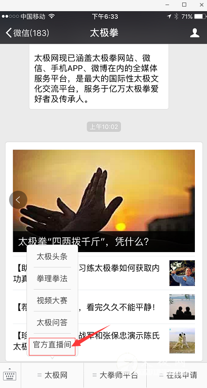 (2)点击微信平台底下太极网菜单“官方直播间”(图中红色标注),随时随地观看直播