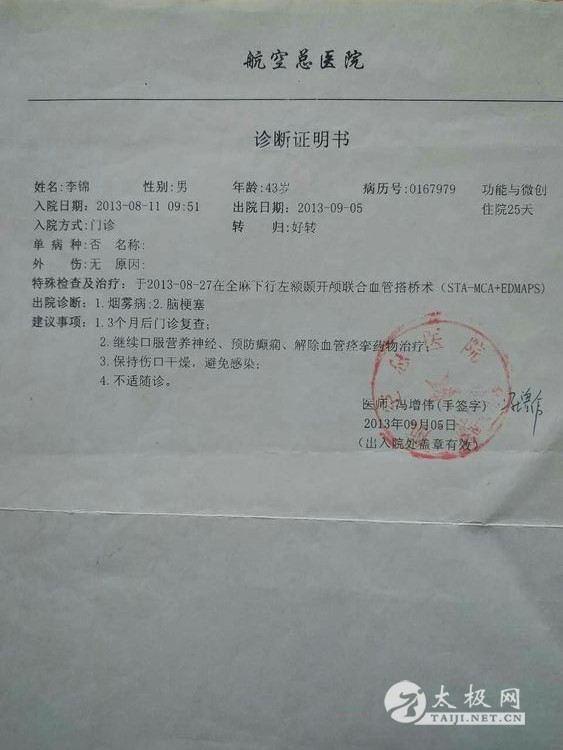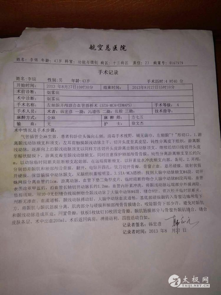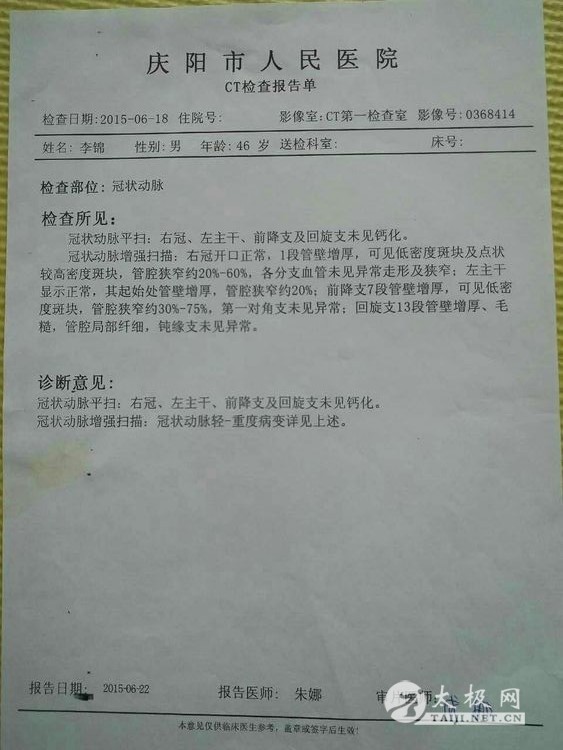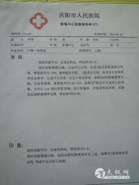 大家好!我叫李锦,47岁,脑梗患者。于2009年12月得病,发病时的症状是右侧肢体及语言功能受到很大的限制,后经庆阳市人民医院一个多月的治疗后出院。出院后能参加日常工作。两年后在一次工作活动中,突然再一次发病晕倒在单位的院里。当我苏醒后感觉身体右侧绵软无力,毫无知觉,脚手也不能自理,走路只能靠一副拐杖勉强支撑。 脑梗手术情况 在那段痛苦的日子里,天是昏暗潮湿的,日子是阴冷的,整天度日如年,仿佛是一只折翅小鸟,只能仰望天空叹息,就连做梦都梦见自己可以健步如飞!然而梦醒后的现实生活却是残酷的,绵软的肢体就是不听使唤,连一张薄如蝉翼的纸片都无法拿起。我彻底绝望了,难道后半生就只能依靠轮椅和拐杖度过吗?不!我绝不要这样的结果,这不是我想要的生活,我要勒住命运的喉咙,要它为我屈服,为我改变,于是我开始夜以继日的上网查找各大医院的信息,终于有一天我看到网上报道北京有家医院做脑血管搭桥手术可治疗偏瘫,于是第二天我便贱卖了唯一的房子踏上了去往北京的火车。终于三个月后我又重新回到了我热爱的故土。刚开始还只能靠拄拐走路,走着走着病患的肢体有了一丝力量的感觉,就这样慢慢的能拎起一两斤东西,后来脚上也渐渐有了力量,我每天坚持从一步到十步,到百步,到千步…… 两年后我已恢复到正常人的八九成了,但我不满足现状,我要奔跑!我要跳跃!我要去健身房尽情挥洒汗水。别人骑单车半个小时就休息,而我要坚持一小时都不休息,在劲爆的音乐刺激中挥汗如雨。然而,我的健身计划实施不到两个月的时候,明显感到运动时胸闷,心前区刺痛,心脏好像有双无影的手在揪着,撕扯着揉搓着,疼痛难忍……最终我因高强度锻练过度而患上了冠心病中最厉害的一种心梗。当看到冠状动脉CT报告单时我惊呆了!冠状动脉有两处狭窄,两处斑块和一处不完全心肌桥,最大一处狭窄居然达到75%。这完全达到放心脏支架的严重程度了啊!上天又给我开了一个如此大的玩笑!到底是支还是不支?我陷入深深的迷怕中……支吧,才做脑梗手术还没彻底恢复,又要做心脏手术!不做吧,生命随时都会面临终结……此时此刻,内心是多么的纠结!矛盾!无助和害怕! 又被查出心肌梗塞 这天晚饭后,我怀着忐忑的心情信步来到公园遛弯,盛夏的广场上好不热闹,大妈们有的在扭秧歌,有的欢快的跳着水兵舞,还有的在高歌,低沉的萨克斯风如泣如诉……我苦笑一声摇摇头……如此的欢歌笑语已然与我没有什么关系了…… 我低头前行,忽然从远处飘来一阵悠扬的古琴声,那曲风舒缓而又绵长,像一股清泉流入心田,给燥热的情绪送来一丝凉爽,我顺着音乐声举目望去,原来有人在湖畔习练太极拳,其中一女子最引人注意,她身穿玫红色太极服,脚蹬一双白色练功鞋,一头乌黑的长发扎在脑后,看上去是那么的神采奕奕。在夕阳的挥洒下,伴随着音乐节奏的流淌,她时而穿蹦跳跃,时而躬身低俯,一袭红色的长衫十分飘逸,显得格外美丽!我呆呆地看着,忘却了所有的病痛的折磨,心灵忽然彻底放松了,就连空气霎时变得新鲜而又清香,湖水也温柔的泛起了波纹……这名女子就是我们的太极拳教练――黄明兰老师。 一周以后,我正式加入了习练太极拳的行列中!自从我加入了太极队伍以后,人整个就脱胎换骨了,人变得很精神,脸色也红润了,而且,血压从最初的100/140,逐渐降到80/120,而且还彻底摆脱了降压药的控制。 老师带我们练太极茶韵(中间的就是我) 刚开始学习太极拳,每天早晨六点钟我便起床到公园,黄老师带着我们新学员从热身,站桩,缠丝到打套路,都一丝不苟的带着练,一遍又一遍耐心的讲解示范,而我也是学员中最让老师费心的一位,动作总是记不住,老师就一遍遍的讲,手把手的教,一招一式带着我做,就这样我对太极拳从有兴趣到有了更深的领悟!兴趣也变得更加浓厚!如果哪天没练太极,就好像缺了些什么,心里空落落的。 就这样慢慢地我把老架一路学完,通过老师反复的给我整架子,顺架子,捏架子……我才渐渐感觉到太极拳的深奥,为了自己有个健康的身体,我把习练太极拳当成了我每天的工作…… 每天凌晨四点半我准时醒来,稍作调整便开始每天早晨的卧功练习:首先取掉枕头平躺床上,两腿自然伸直,后背平贴于床铺上,两手交叉放于肚脐下两寸处,全身放松后开始吸气,随着由浅至深地一呼一吸,下腹部也随着一鼓一收,呼吸慢慢变得深长。注意吸气时,胸隔肌上提,小腹内收,气沉丹田;呼气时,胸隔肌下沉,小腹外鼓。在这个过程中,呼吸要保持平稳顺畅,思想要集中,就像老师常说要做到意守丹田。这就是练习太极拳的逆腹式呼吸法。这种功法对初学者练习松、沉、静、稳有很大的帮助。 卧功完成后可以轻轻拍打全身,从而达到疏通全身经络的作用。之后就起床洗漱,出门到东湖公园我们的教学处随老师晨练。练拳之前一定要充分做好热身活动,从头到脚全身关节都要活动开,然后压步伐,拉韧带,辅助练习踢腿,下蹲等一些协调灵活性动作。随后正式开始太极拳的基本功练习――桩功。桩功也是太极拳精髓所在。 我们的太极家人在晨练 练习桩功要循序渐进,切不可急于求成,刚开始练不要站的太低,微屈膝,双手抱圆自然放于胸前。关键是一定要做到立身中正,虚领顶劲,松肩沉肘,含胸拔背;同时要做到内想,内观,内觉;全神贯注的进行自我体察。这样才能达到