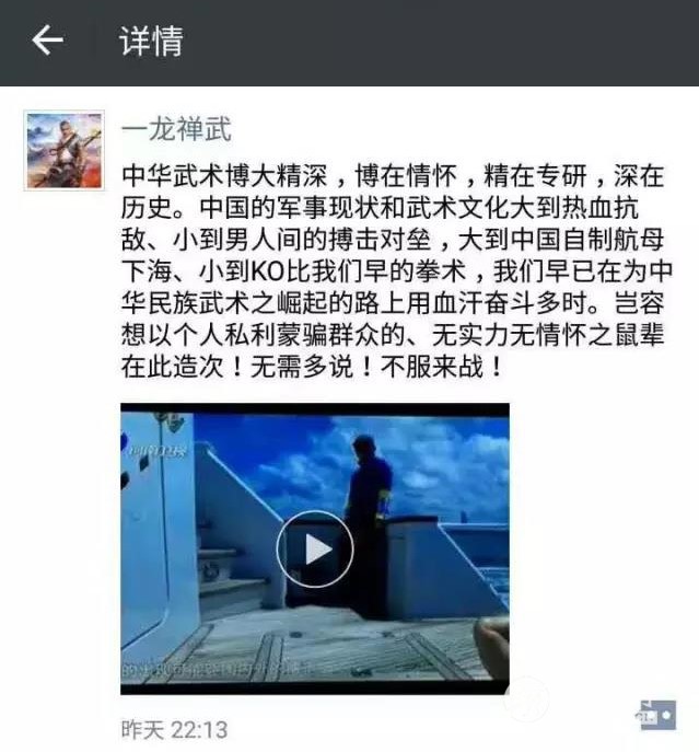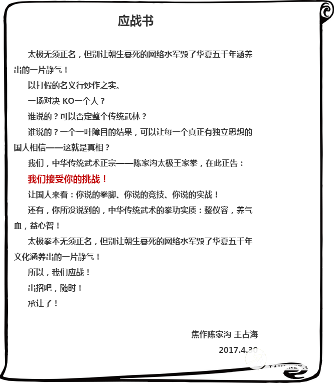 4月27日晚的一场直播“约架”事件刷爆了小编的朋友圈,甚至登上国内各大新闻平台,只因这次“约架”被冠上了“50年来太极拳首次登擂10秒被KO”的醒目标题。 先不说“约架”双方何许人也,是否能充分代表太极拳或者MMA格斗。小编其实充分理解那些从小看着武侠小说长大,对太极拳叶不沾身、风生水起、以柔克刚充满着浪漫主义幻想的吃瓜群众们,看到这样的标题会有怎样的吃惊,回头一想又觉得十分有理:“果然现实中不存在随手一撮能吸起一团枯叶的特异功能嘛!所以太极拳都是骗子!骗了我这么多年!”这就好像我们儿时听到童话中的公主都是肤白貌美,乍一看如今某些君主立宪制国家的公主也是普通人的样子,于是心理难以接受,忍不住在新闻底下评论个“丑”。 我们身处眼球经济时代,媒体劲爆的标题,徐晓冬污秽的谩骂,赚足了网络点击量。在利益的助推下,徐晓冬挑战中国武术这一话题被越炒越热,越来越多的太极人在了解事态之后开始发声。 陈沟王占海、王占军兄弟及徒弟和陈自强弟子以及四川太极推手研究会会长路行等太极拳传人已经向徐发起挑战,用实际行动来为太极拳正名。 国家级非物质文化传承人王西安大师长子,王占海及其弟子陈前师徒双双表示,接受徐晓冬挑战,并欲借此弘扬习武之人应有的武德、道德和口德。 在徐的个人微博中,他表示只和各门派掌门人打,只和师父打。针对这种言论,陈前说:“非要和我师父打,那我也要挑战你的师父,徐晓冬你同意吗?” 王占海在接受媒体采访时表示:“接受挑战,太极拳无需正名更不容玷污”。在王占海看来,徐晓冬对中华传统武术发起的挑战是以打假的名义行炒作之实。“他的意图很明显,就是博出位,想出名。所以他都是找这个行业最高光的人物来挑衅,制造话题热度,从而开始自己扭曲的成名方式。”王占海强调,之所以接受挑战,仅仅是为了太极拳的声誉,并非是接受那些顶着牌匾,却又隐藏私心的乌合之众的挑逗。 而对于徐晓冬扬言要一晚挑落2-3位武林掌门,且不跟这些掌门弟子较量,王占海颇为不屑。“现在很多武林掌门,绝大多数年事已高,你徐晓冬正当年,在体能和力量上占先,因此这种狂妄首先在道义立场上就失去了平衡,站不住脚。”王占海表示,即使年少的掌门人也不屑于和一个没有武德之人对抗。 “徐晓冬口口声声说要‘打假’,却连一个弟子的挑战都不敢接受,如此看来一方面其本人实力有限,另一方面又想借挑衅高光人物出名。因为这个过程越复杂,越能不断制造话题效应,即使他输了,刷存在感的目的也达到了。”王占海认为,徐晓冬的目的就是炒作,选择仅和掌门人PK当然更能吸引眼球。
