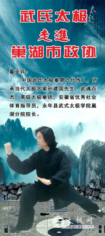 翟亚兵老师系武氏太极拳第六代传人,师承当代太极拳名家孙建国先生,为武魂百杰,武式太极拳高级拳师,安徽省优秀社会体育指导员,现任永年县武式太极学院巢湖分院院长。