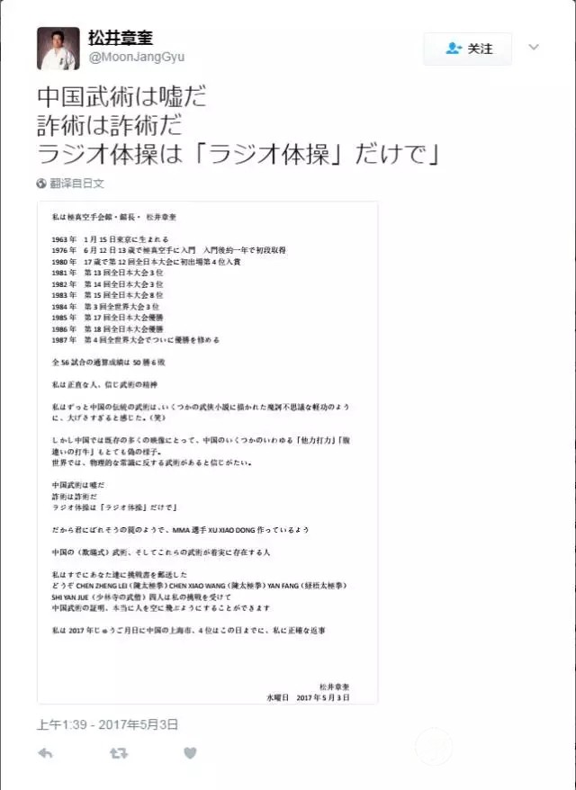 徐晓冬先生与魏雷先生比武的事情似乎刚刚以徐晓冬先生被成都警方约谈、微博被删为结果落下了帷幕,但小编意外发现关于“打假”和“XX约战太极拳”的海量新闻中,赫然出现了一则名为《松井章圭公开表示支持徐晓冬,中国武术是骗术》的新闻。 文章转载Twitter上一名昵称为“松井章圭”的用户的文章,表示自己是所谓极真会馆馆长松井章圭,在列举了自己一系列的比赛成绩与训练履历后,声称一些中国武术视频中的“借力打力”和“隔山打牛”的技巧是假的,只是广播体操,他支持徐晓冬先生的打假行为,并约战“中国欺骗性武术”的代表陈小旺、闫芳、释延觉等人,希望可以在他5月10日抵达上海前得到准确答复。 这则新闻一出,小编表示震惊,马上到Twitter和Facebook上验证,结果令人想笑。这位自称“松井章圭”的用户,仅仅关注了30名用户,而关注的都是些系统推荐用户,其中多是欧美的体育竞技人士。而在松井章圭先生的Facebook(@Shokei Matsui)上却无相关的声明。 小编翻阅了一下,这个所谓“松井章圭”关注的用户中并无一名极真空手道的练习者或师范,作为松井派极真会的负责人,居然没有关注自己的同事、属下,实在是令人称疑。而在Facebook上,Shokei Matsui关注了至少4000人,其中很多是极真空手道的练习者。 之后小编发现了这个骗局的最大漏洞,堂堂松井派极真会负责人,竟然使用了新极真会绿健儿先生的照片作为封面图,而绿健儿先生所在的新极真会曾经是反对松井章圭先生继任极真会馆馆长的最大派系。 也就是说,在这个骗局中,松井章圭先生和绿健儿先生达成了和解,而众所周知,这是完全不可能的,只能说骗子对极真空手道的历史缺乏最基本的了解。 那么,为何会出现这样的闹剧呢? 事实上,在徐晓冬先生与魏雷先生比武结束之后,许多朋友纷纷以极真空手道举例,大谈极真空手道被泰拳击败后,痛定思痛改革空手道,最终达成了传承、文化、武道和竞技的完美结合,希望武术界可以效仿极真空手道进行切实可行的改革。 当然,我并不是说他们就是在故意黑空手道或是极真空手道,他们是为中国武术的未来发展提出了他们的见解和看法。 但可以说也是因此极真空手道成为了民粹主义者又一个新的攻击目标(当然,也不排除某些有极真空手背景选手参加的赛事组织方在炒作)。 在此,我想说的是,中国空手道界或国际空手道界,长年以来并不参与“武术是否能够实战”或“是否是意淫”的辩论,这些辩论与空手道练习者无关。 空手道练习者坚持按照空手道的练习方式和技术要求进行练习,追求的是能够拥有更好的空手道水平和更完善的人格,其他任何的东西与空手道练习者无关。 对于此次的假冒日方师范挑动民族情绪的恶略行为,小编组对此表示最大的鄙视,希望看到本篇文章的空手道练习者们能够积极转发这篇文章,防止不明真相的群众被利用,防止还在发展期的中国空手道遭受无妄之灾。希望松井派极真会的中国地区负责人可以就此事与日本总本部方面进行求证。 最后,我再次强调!松井章圭“挑战”中国武术是假新闻,是民粹主义者为个人利益制造的骗局! 文/王扁豆 来源微信平台:空手道场 |