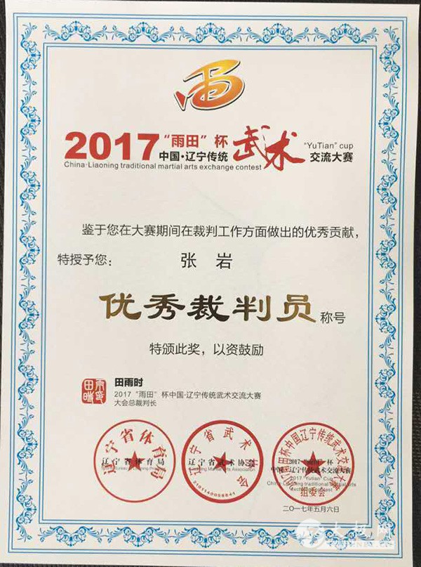 “很高兴第七次应邀担任太极推手裁判,公正、公平、严肃、认真执裁,尊重参赛运动员的训练成果,一直是我的执裁理念。” 为了给全省广大武术爱好者搭建交流技艺平台,挖掘、整理、弘扬传统和民间武术,着力提高传统武术的国际影响力,促进全民健身活动的蓬勃发展。经辽宁省体育局、辽宁省武术协会批准,定于2017年5月5日至5月7日在本溪市举办2017年“雨田”杯辽宁省武术传统交流大赛。来自国内、外107个代表队,2000余人的武术运动员,进行了为期两天的激烈角逐。赛会内容包括:传统武术比赛和太极推手比赛,鉴于大赛期间在裁判方面做出的优秀贡献,辽宁省体育局、辽宁省武术协会、大会组委会授予我市张岩为优秀裁判员。 张岩,辽宁省太极拳推手研究会副秘书长,辽宁省形意拳研究会副秘书长,陈家沟太极拳研究会朝阳分会理事,朝阳市太极拳推手研究会秘书长,辽宁省太极拳教练员、裁判员,国家一级社会体育指导员,多年来跟随恩师中国武术七段谢广田在省、市进行武术交流,弘扬、传播中国传统太极文化。 “每一次参加赛会裁判工作,都在实践中逐步完善执裁能力和业务能力,每一次都把国家太极拳推手裁判的新规则和实战技术带回朝阳。”相信,朝阳一定能打造出一支“崇文尚武”的精干团队,在不久的将来,太极拳推手一定会取得更好成绩。 |