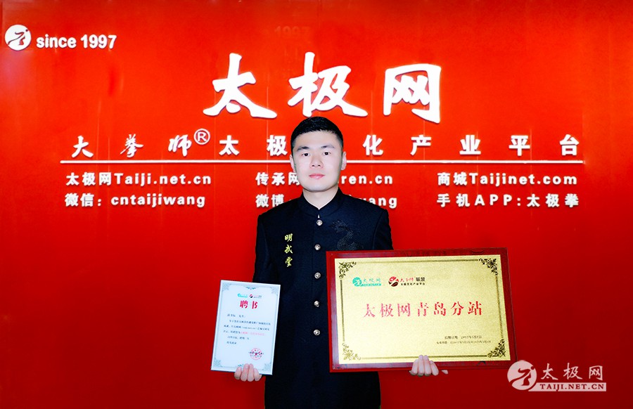(太极网青岛讯)5月8日,太极网(taiji.net.cn)青岛分站正式挂牌成立,明武堂太极国术院创始人郭书辰任分站站长。 郭书辰在接受太极网青岛分站站长聘任时表示,非常高兴能够受聘担任太极网青岛分站站长,太极网青岛分站的建立对自己来说既是动力也是压力,他相信太极网青岛分站一定会帮助和推动清远及其周边地区做好太极拳的推广和传播工作。同时,也会让更多的人通过太极网的平台更加深入的了解太极拳和太极文化,从而更好的学习太极拳。郭书辰表示自己将会带领太极网青岛分站在太极文化传播推广以及太极拳传承谱系建设推广上积极展开工作,为太极拳传承人、拳师、拳馆服务,致力于打造一个让广大太极拳爱好者互通有无、相互交流、共同进步的平台,共同为弘扬太极拳、传播太极文化不懈努力! 郭书辰 郭书辰,山东滕州人,中国共产党党员,陈家沟陈氏 第十九世、国际太极拳大师 陈小旺 入室弟子, 陈氏太极 拳第十二代传人, 中国武术协会 会员,中国武术六段,明武堂太极国术院创始人。 郭书辰与师父陈小旺 郭书辰自幼练习武术,后拜在陈氏太极拳十九世掌门人陈小旺宗师门下,其太极功夫具有迅、猛、灵、惊弹的特点,对太极拳理论颇有见解。演练套路似行云流水,连绵起伏,舒展大方,形神兼备。