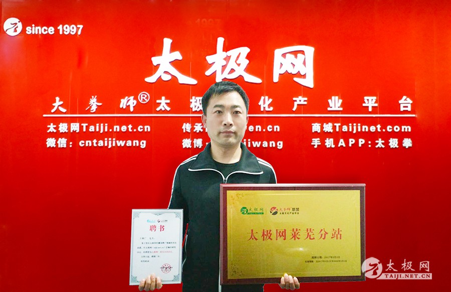 (太极网莱芜讯)5月13日,太极网(taiji.net.cn)莱芜分站正式挂牌成立,“2016年度最美太极人”王林广任分站站长。 王林广在接受太极网莱芜分站站长聘任时表示,感谢太极网对自己的信任,莱芜分站的建立将进一步推进莱芜及其周边地区的太极拳的推广和传播工作。王林广表示自己将会带领太极网莱芜分站为太极拳传承人、拳师、拳馆服务,致力于打造一个让广大太极拳爱好者互通有无、相互交流、共同进步的平台,共同为弘扬太极拳、传播太极文化不懈努力!