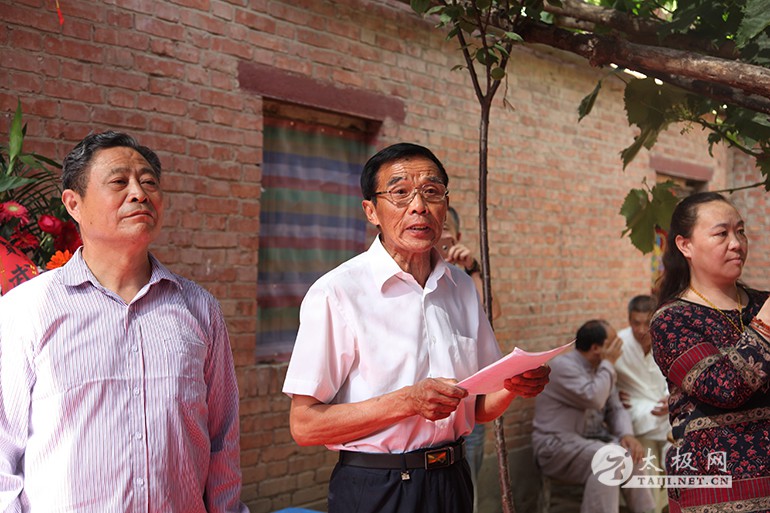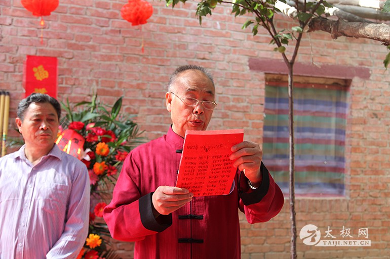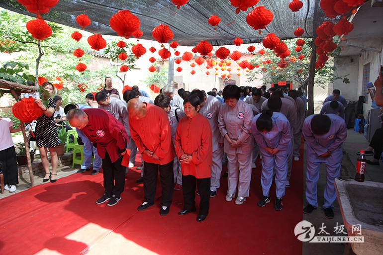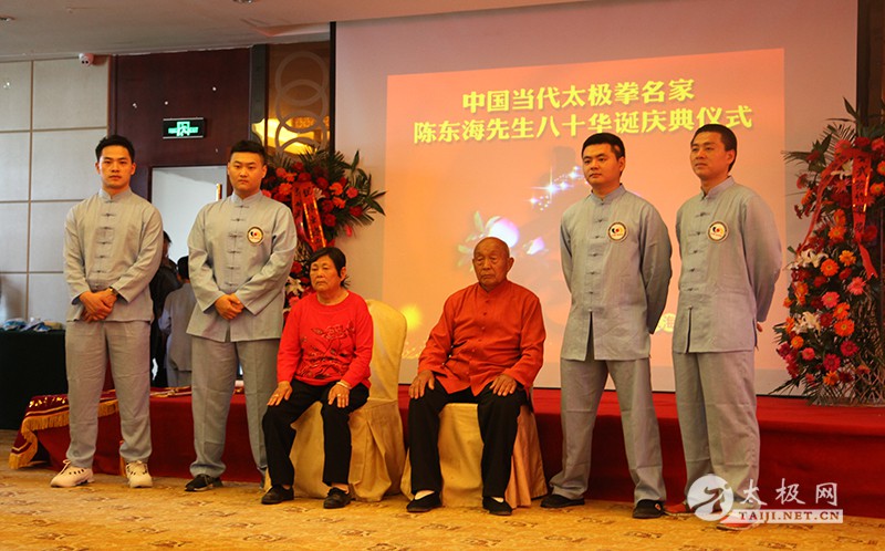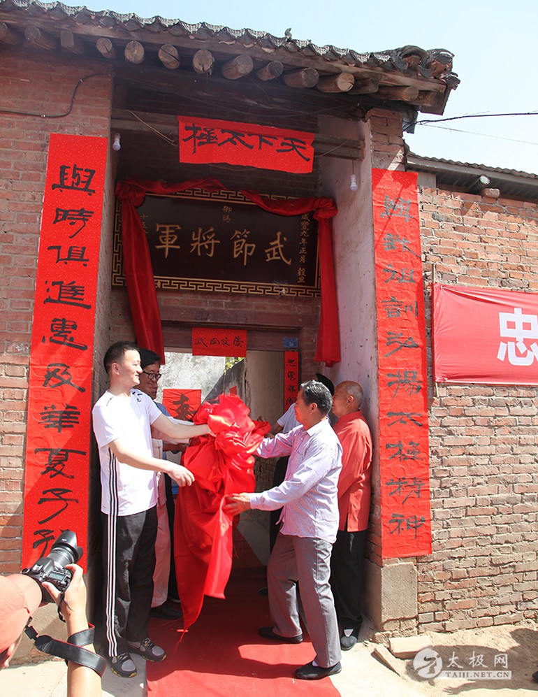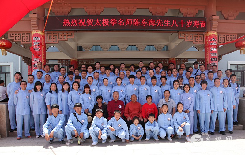 (太极网报道)2017年5月13日,太极拳名师陈东海八十岁寿诞庆典仪式于太极拳发源地温县陈家沟举行。出席活动的领导及嘉宾有温县政协副主席严双军,温县县委宣传部副部长、温县太极拳武术文化管理中心主任王海昌,陈家沟村支部书记村长陈景元,一代宗师陈鑫之曾孙陈东山,陈家沟太极拳名家陈立法,陈家沟陈氏家族理事会理事长陈一华,太极网创始人、温县太极拳传承人联合会主席刘洪奇等。从全国各地赶来为陈东海老师祝寿的弟子及再传弟子一行数百人带着浓浓的祝福和衷心的祝愿来到陈家沟,共同庆祝陈东海老师八十岁寿辰。 寿诞庆典开始前,众人于陈东海老师在陈家沟的祖宅举行“武节将军”牌匾揭牌仪式,以此纪念其十五世祖陈仲甡、陈季甡文韬武略,智勇绝伦,因战功闻名于世并于清咸丰九年被御赐“武节将军”之荣耀。 陈东山主持揭牌仪式 揭牌仪式由陈一华主持,仪式开始后,全体人员肃立,向太极拳始祖及历代宗师先贤行礼,缅怀先辈之风华,感念先祖之功德。随后,陈东海与夫人一同上前向先祖行礼、上香、敬酒并施叩拜礼。陈东山上前敬香,到场众弟子依次上前敬香行礼。 祭祖仪式 祭祖仪式圆满礼成。严双军、王海昌、陈景安、陈立法一道为“武节将军”匾额揭牌。 揭牌仪式 揭牌仪式礼成之后,陈东海老师八十岁寿宴庆典活动于陈家沟王廷大酒店拉开序幕,严双军为庆典仪式致辞,来自全国各地以及陈家沟当地的拳师纷纷登台献艺,向陈东海老师送上生日的祝福。 庆典活动现场嘉宾(部分) 名家表演结束后,陈东海老师家族代表致欢迎辞,向到场嘉宾以及不远千里赶到现场的众弟子们表示欢迎和感谢。陈东海老师的子孙以及弟子门生依次上前拜寿。温县电视台新闻部副主任李军营主持拜寿仪式。