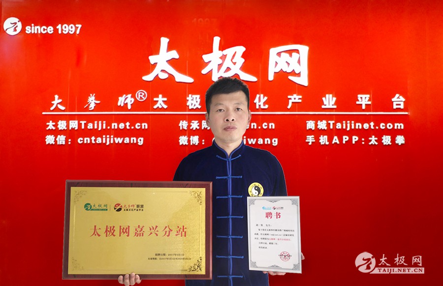 (太极网嘉兴讯)5月24日,太极网(taiji.net.cn)嘉兴分站正式挂牌成立,平湖市陈家沟一剑太极培训中心总教练赵一鉴出任嘉兴分站站长。 赵一鉴在接受太极网嘉兴分站站长聘任时表示,感谢全球首家太极拳门户网站太极网总部对自己的信任,太极网嘉兴分站的建立对推动嘉兴及其周边地区太极拳的推广和传播意义重大,后续将会和总部加强联系合作,带领太极网嘉兴分站在太极文化传播推广以及太极拳传承谱系建设推广上积极展开工作,为太极拳传承人、拳师、拳馆服务,致力于打造一个让广大太极拳爱好者互通有无、相互交流、共同进步的平台,共同为弘扬太极拳、传播太极文化不懈努力!