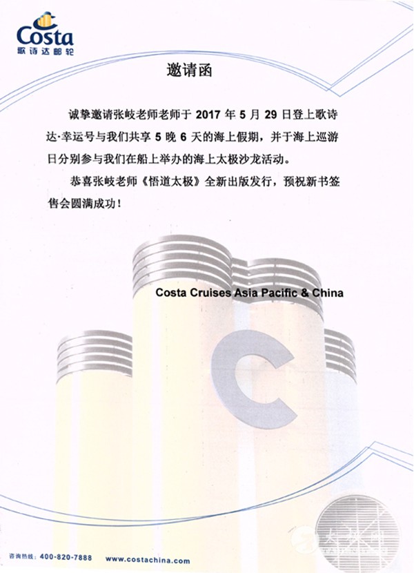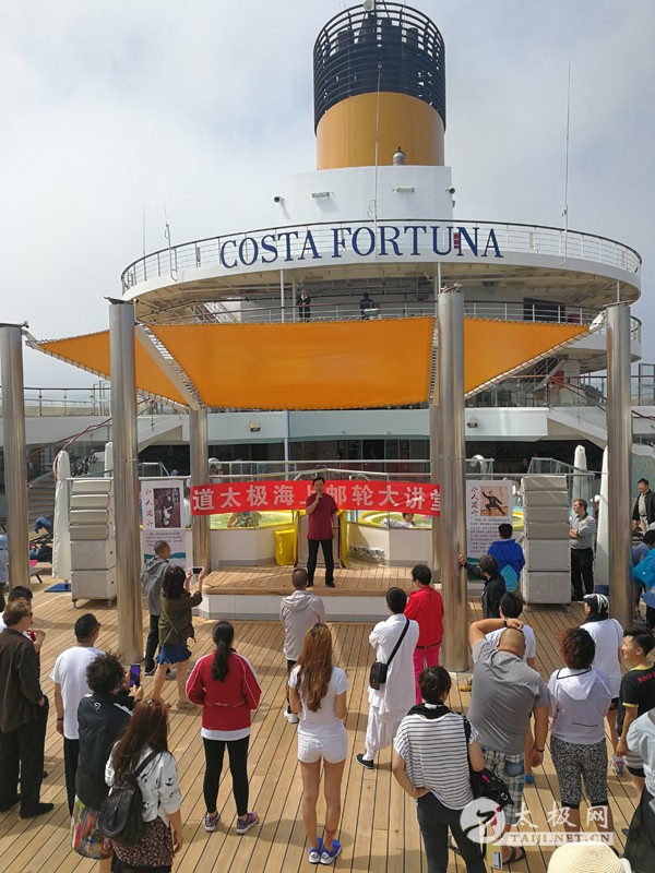 (太极网报道)2017年5月29日至6月3日,世界太极拳联谊会常务理事、中国辽宁分会会长,太极网2016年度十大影响力人物,辽宁省太极拳推手研究会副会长、沈阳悟道太极文化传媒有限公司董事长张岐应意大利歌诗达邮轮公司盛情邀请,并在游够天下国际旅行社的大力支持下,率领陈氏太极拳第十二代优秀传承人沈玉明、姜锡哲、聂洪齐、李丽晶、马显现携手意大利歌诗达邮轮公司“幸运号”在船上成功举办“劈波斩浪一带一路传拳海外,悟道太极海上邮轮讲堂开课”活动! 大讲堂上已出版《悟道太极》专著的张岐老师系统讲解了太极文化理念,以及太极拳理、拳法,太极拳的起源传承发展现状。沈玉明、姜锡哲、聂洪齐、李丽晶、马显现师兄妹先后教授了太极放松功,精典陈氏九式太极拳,来自海内外众多太极拳习练者,爱好者热情高涨,积极参予,对博大精深的国粹传统太极文化有了更深刻的感悟,学习中一丝不苟,神情专注,在全民健身运动中,真正认识到,习练太极拳,健康过一生的养生理念。 来自国内各地及海外的百余名太极拳习练者、爱好者积极参加了此次大讲堂活动。邮轮上逾三千名中外游客及来自世界五十多个国家和地区的近千名工作人员,共同见证并感受到了太极拳这一博大精深的中华民族优秀传统文化,大讲堂达到了弘场中国传统文化,广泛传播国术精粹的目的,大讲堂的课程及几位师兄弟妹的表演,深深地感染和激发了船上游客,强身健体,习练太极的锻炼欲望,课上、课下大家纷纷表达出了强烈的学习热情! 责任编辑:太极网小洁 |