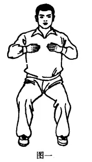 我在拙著《太极拳入门》 第四章“桩功”中说:“站桩的种类很多,习太极拳的人,一般只练浑元桩一式就行了。” 浑元桩,一作“浑圆桩”,又有“抱云桩”“云门桩”“养气桩”等异名。其档步成二字马步,或作八字马步。具体方法如下: 两足并行开立,与肩同宽,或比肩稍宽。两足尖指向正前方,或略成八字。两腿屈膝下蹲,初学或体弱者,可采用稍微屈膝的“高桩”;久练者应采用大、小腿之间弯成135度角左右的“半桩”。重心放在两腿之间,足心含虚,全足踏实。上体自然正直,头顶起、裆落下,精神提起,含胸拔背,沉肩坠肘,尾闾中正,立身安舒(图一)。其身法基本要领与太极拳架全然相合。在屈膝下蹲的同时,两手由两侧回环上提,环抱于胸前,使两掌心与乳心遥遥相对,中间相隔一横拳半。两手十指和掌心也遥相对应,两手指尖之间,相距一横拳左右。两掌心朝里而略为朝下,腕根塌沉,掌心含虚。两肘须略低于腕部,并用意里裹。全身务须有下沉的气势。 这种两臂环抱的站桩姿势,在技击意义上含有“守中”的意思。即:以头顶百会穴至裆下会阴穴一线为中心线,使全身重心自然地落在两足之间的中心,这样,身法与裆步自然中正安舒,稳定性好,其所以置两臂、两手于圆周线上,乃是含有防御和待机反击、抢攻之攻守意识。因此,腋窝要虚,而两胁空隙相对的要实。两腋虚,则臂部弹性充足,伸缩余地较大;两胁实,则边门不易受侵。但腋虚胁实是结合两臂、两肘来说的。两臂即要用意外撑,又要用意里裹,这是有意识地锻炼两臂的掤撑之劲,兼含待机掤发击敌、以及守中防护心窝、胃院、胁腋等部的职责。在此姿势的基础上,一旦化静为动,只须以肘为轴,举手向上即可护及头面,落手向下又可防守裆膝。这充分说明武术站桩与养生气功站桩,在要求上是不尽相同的。突出地表现在武术站桩的心理意志训练、放松训练、耐力训练、形态训练和呼吸训练等等,几乎无一不与武术技击要求密切相关连。